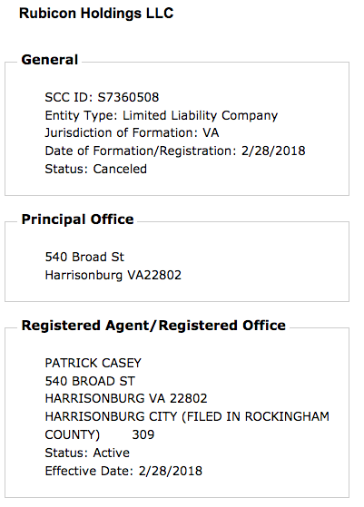 A cursory search of the Virginia State Corporation Commission reveals that Patrick Casey is the registered agent, forming the shell company on February 28, 2018, shortly after assuming the top leadership position of Identity Europa. As of February 4th, 2019, the company’s status was listed as “Canceled”.