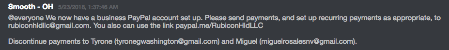 In May 2018, @Smooth – OH announced the new business PayPal and Gmail account for payments – Rubicon Holdings LLC.