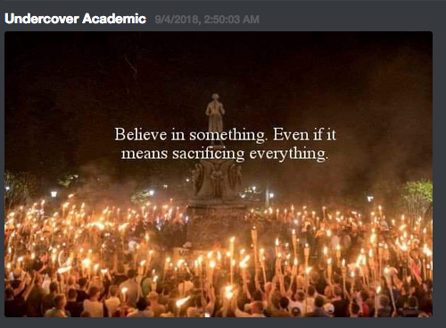 Text from Colin Kapernick’s Nike campaign pasted over an image of the torch rally in Charlottesville, VA from August 11, 2017