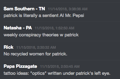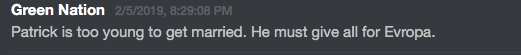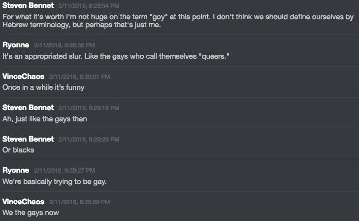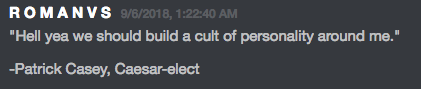 Patrick has worked to build up a cult of personality around himself and his delicate dictatorship. Patrick tenderly enforces his 14 rules on the server, while also encouraging gentle ribbing of fellow members and twisted idolizations of himself. While one could chalk much up to typical internet trolling and joking, given Casey’s position as the head of a white supremacist/nationalist organization, it is no laughing matter.