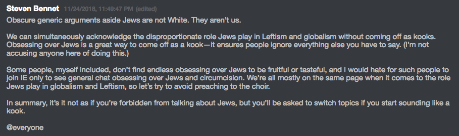 After Nathan Damigo’s departure post-Unite The Right, and then Elliot “Eli Mosely” Kline’s meteoric fizzle in November 2017, little Patrick Casey, then IE “Chief of Staff”, decided it was his turn for big boy pants and has been crafting his veneer of delicate dictatorship ever since. In fact, instead of the 14 words, the IE Discord Server has 14 rules, posted by William Clark of Philadelphia, (@sigruna14) the National Server Administrator.