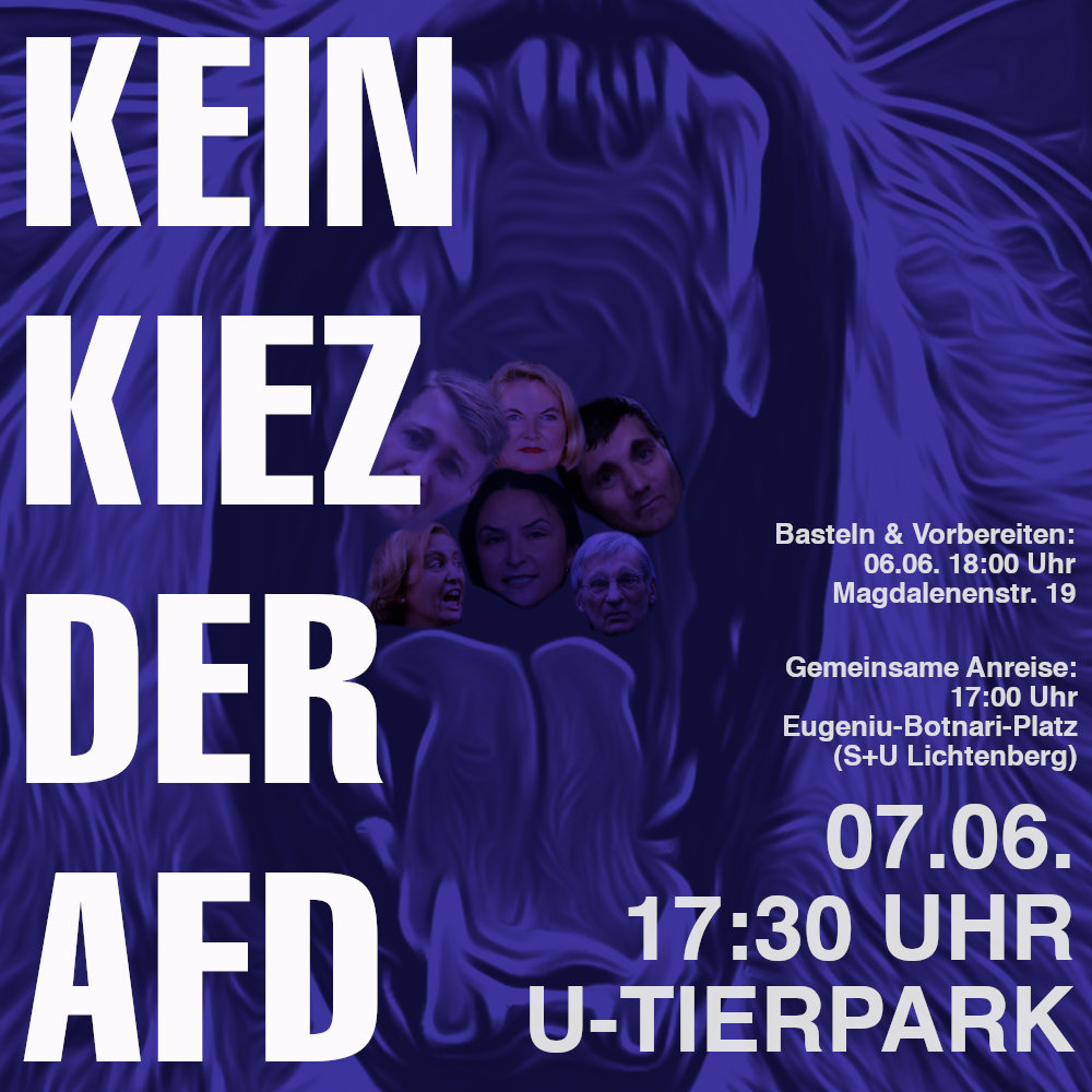 Die sogenannte Alternative für Deutschland plant nach einem – für sie desaströsen – Europawahlkampf eine Abschlussveranstaltung am Freitag, 7. Juni 2024 in Lichtenberg (nähe U-Bhf. Tierpark, Heinrich-Dathe-Platz, 10319 Berlin).