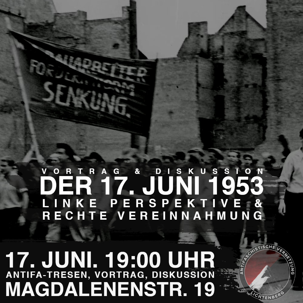 Der 17. Juni 1953 ist eine Erzählung, die vielen jüngeren Genossinnen wenig sagt oder wir aus konservativer bis neonazistischer Ecke kennen und die ein Narrativ eines antikommunistischen „Volksaufstands“ bedient. In den vergangenen Jahren hat auch „Der III. Weg“ regelmäßig den Termin bespielt und mit größer angelegten Infostandtouren durch den Osten Berlins, vor allem aber in Lichtenberg, auf sich aufmerksam gemacht. Linke & emanzipatorische Kräfte setzen sich mit den Ereignissen rund um diesen Tag selten auseinander. Wir wollen mit euch diskutieren, inwiefern das Framing, das den 17. Juni 1953 begleitet einer Überholung bedarf, welche linken Perspektiven im Aufstand gewirkt haben und was wir für heute für unsere politische Arbeit mitnehmen können. Wir freuen uns, dass für diesen Vortrag die Genossinnen vom „AK Geschichte sozialer Bewegungen Ost-West“ da sein und uns einen Einblick geben werden.