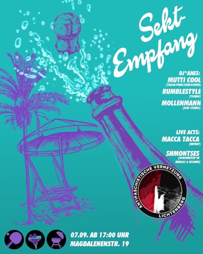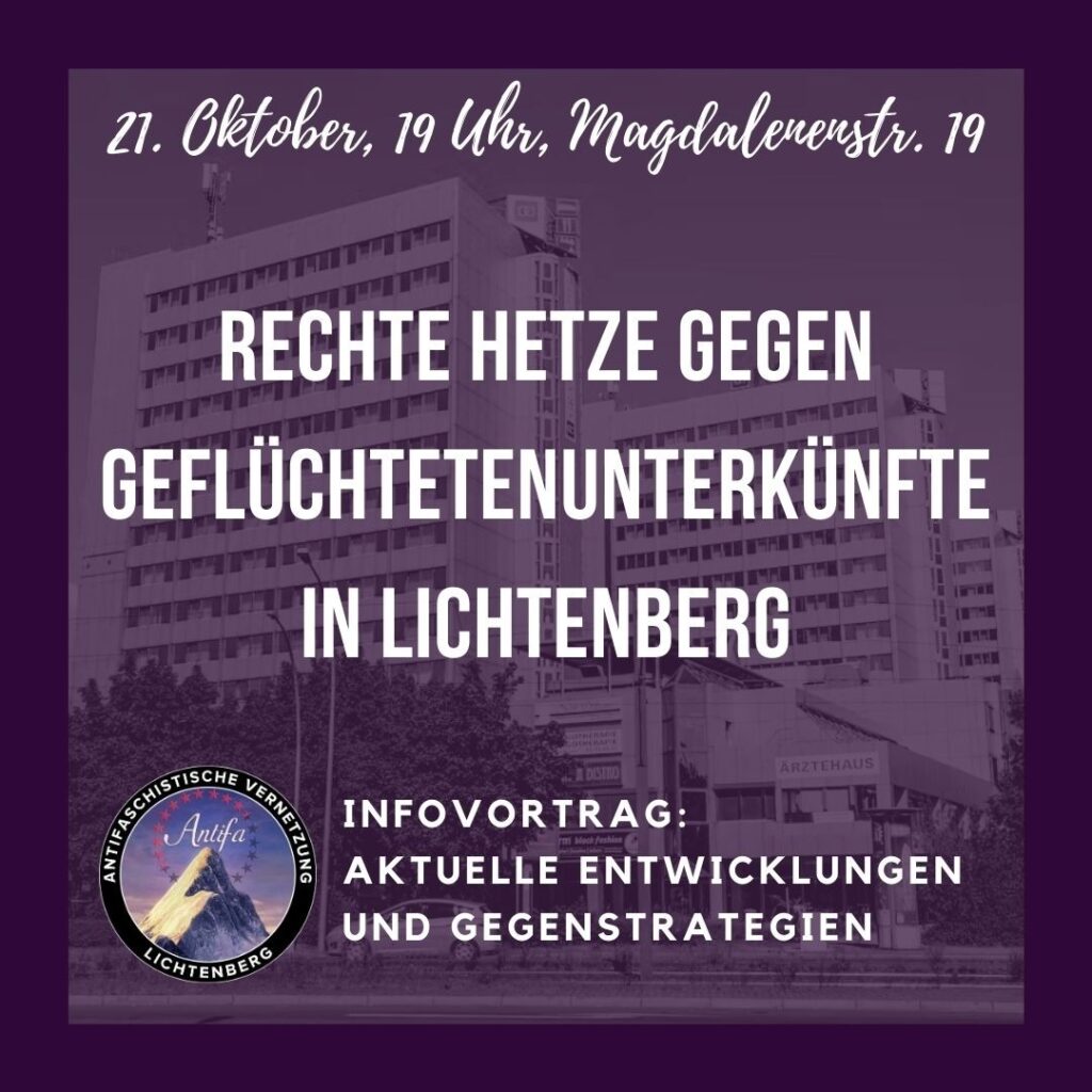 In Lichtenberg geht es dabei momentan vor allem um die geplante Unterbringung von geflüchteten Menschen in einem ehemaligen Hotel an der Landsberger Allee sowie in einer Containersiedlung in Hohenschönhausen. Bei unserem Tresen wollen wir zusammen mit dem Lichtenberger Register die aktuellen Entwicklungen beleuchten und Handlungsstrategien gegen die extrem rechte Hetze in unserem Kiez besprechen. Danach wird es wie immer kalte Getränke, salzige Snacks und spannende Gespräche geben. Außerdem besteht wie immer die Möglichkeit uns kennen zu lernen, wenn ihr euch in Lichtenberg engagieren wollt.
