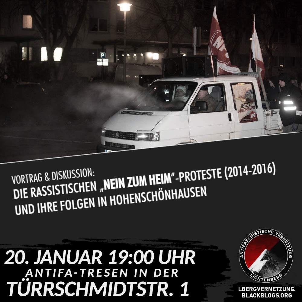 +++ 20. Januar 2025 – 19 Uhr – AVL-Tresen – Vortrag und Diskussion: Die rassistischen „Nein zum Heim“-Proteste 2014-2016 in Hohenschönhausen und ihre Folgen +++