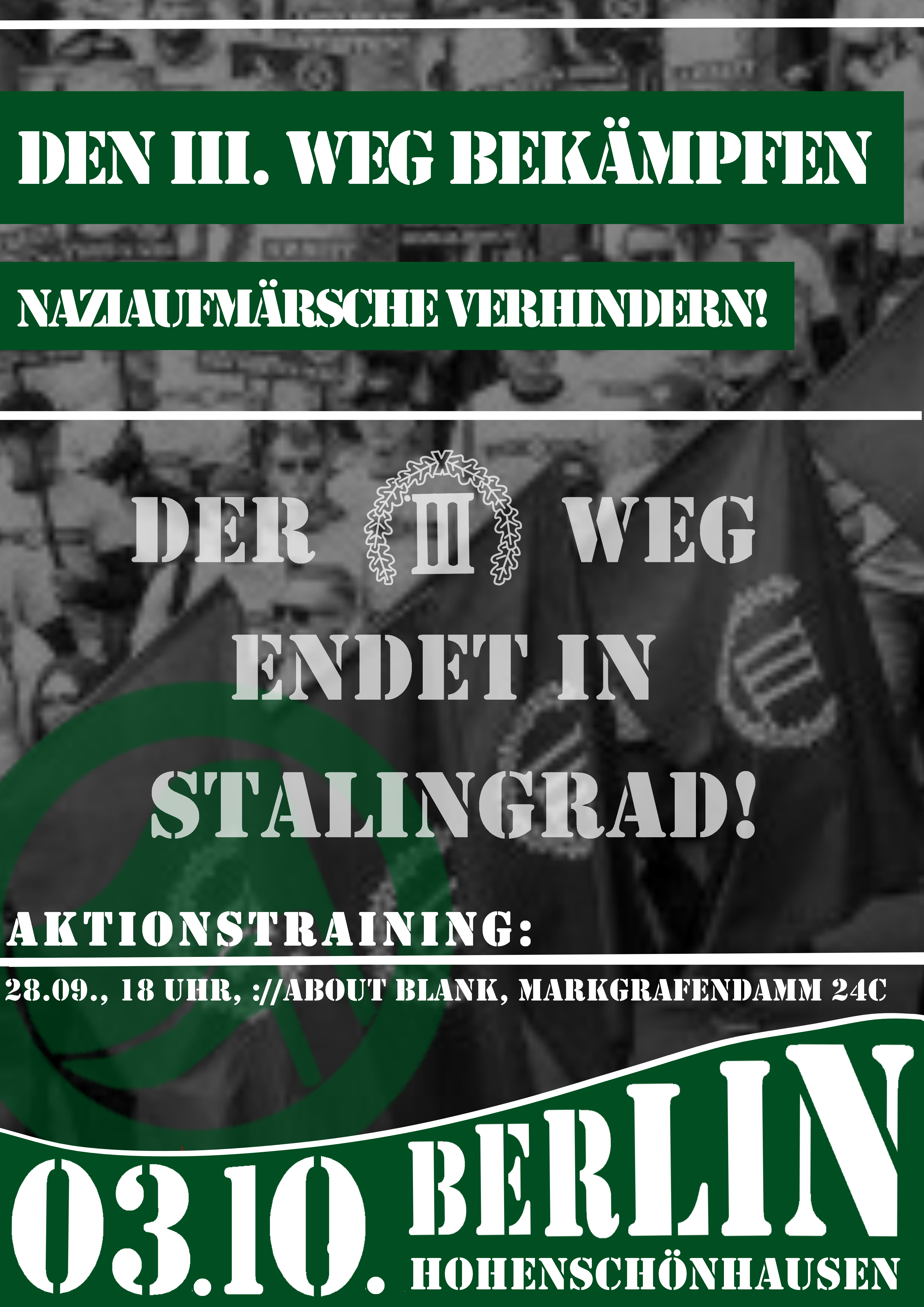 Am 03.10.2020 hat die Neonazi-Kleinstpartei „Der III. Weg“ einen bundesweiten Aufmarsch in Berlin-Hohenschönhausen angekündigt. Wir werden nicht zulassen, dass Nazis durch unseren Kiez marschieren. Als Verbund unterschiedlicher Kiezstrukturen in der “Antifaschistischen Vernetzung Lichtenberg” rufen wir alle engagierten Antifaschist*innen dazu auf, den Aufmarsch verhindern! Wir haben keine Zeit für „fancy” Mobi-Videos und keinen Bock auf „coole“ social-media-Kampagnen. Wer Nazis hasst, kommt nach Hohenschönhausen – so einfach ist das. Am Tag selbst wird es zahlreiche Formen von Gegenaktivitäten geben. Sucht euch aus, wie dezentral oder sportlich ihr agieren wollt. Wichtig ist, dass wir uns alle entschlossen den Faschist*innen in den Weg stellen.