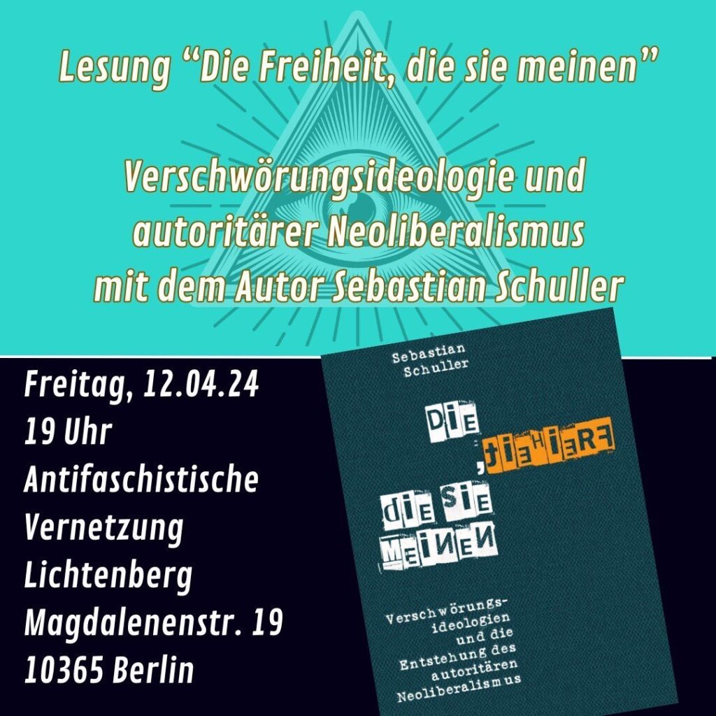 Auch in diesem Jahr lädt euch eure Lieblingsvernetzung wieder zum AVL-Tresen in die Remise ein. Für den ersten Tresen in diesem Jahr konnten wir den Münchener Autor und Literaturwissenschaftler Sebastian Schuller gewinnen, der uns sein neues Buch „Die Freiheit, die sie meinen“ vorstellen wird. In dem Buch geht es um die Überschneidungen zwischen antisemitischen Verschwörungsideologien und neoliberalen Vorstellungen in unserer Gesellschaft. Danach wird es wie immer Zeit für Diskussion, kalte Getränke und Vernetzung geben.