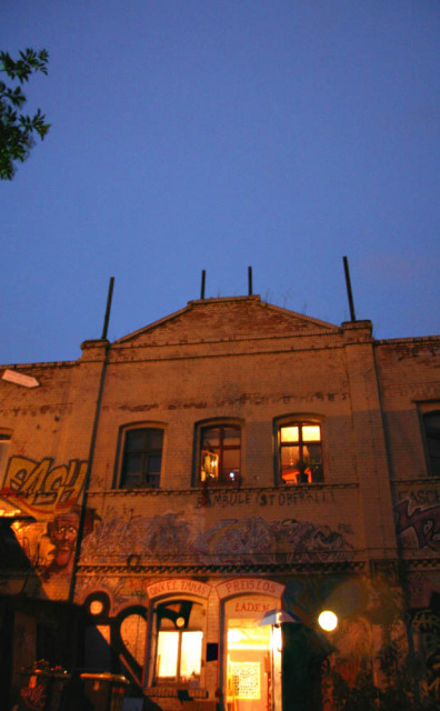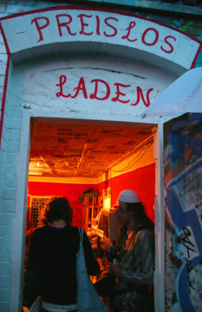 Ja und dann haben wir Klamotten, aber auch andere Dinge wie CDs und Bücher gesammelt und den Laden eingerichtet in nem Raum gleich links, wenn man auf das besetzte Gelände kam. Naja für viele war das auch so ne Art Statement – die Drohung der Räumung wurde langsam stärker, also die Stadt hatte zum Beispiel kurz davor versucht unser Festival zu verbieten und trotzdem haben wir dann einfach weitergemacht und einen neuen Raum erschlossen und aufgebaut. Zur Eröffnung gabs natürlich Sekt, ganz viele Leute waren da, wir haben ne nicht ganz ernst gemeinte Modenschau gemacht und es gab auch einen Diebstahlcontest, wo es eine David-Hasselhof-Platte zu gewinnen gab.“