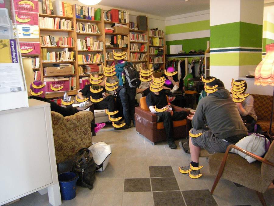 Auf dem Foto auf der rechten Wand zu sehen (nicht zu verwechseln mit der Bibliothek des Inoladens Sabotnik)