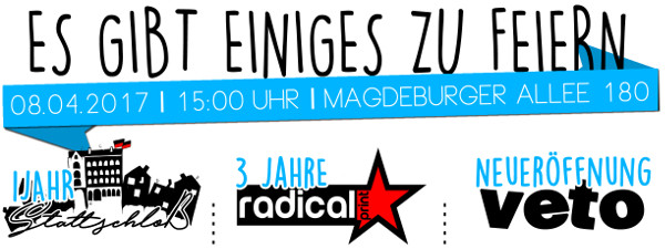 Gemeinsam mit dem Geburtstag vom Stattschloß und Radical Print feiern wir am 8. April ab 15 Uhr die Neueröffnung des vetos in unseren neuen Räumlichkeiten in der Magdeburger Allee 180 in Erfurt. Wir empfehlen: vorbeikommen und mitfeiern!