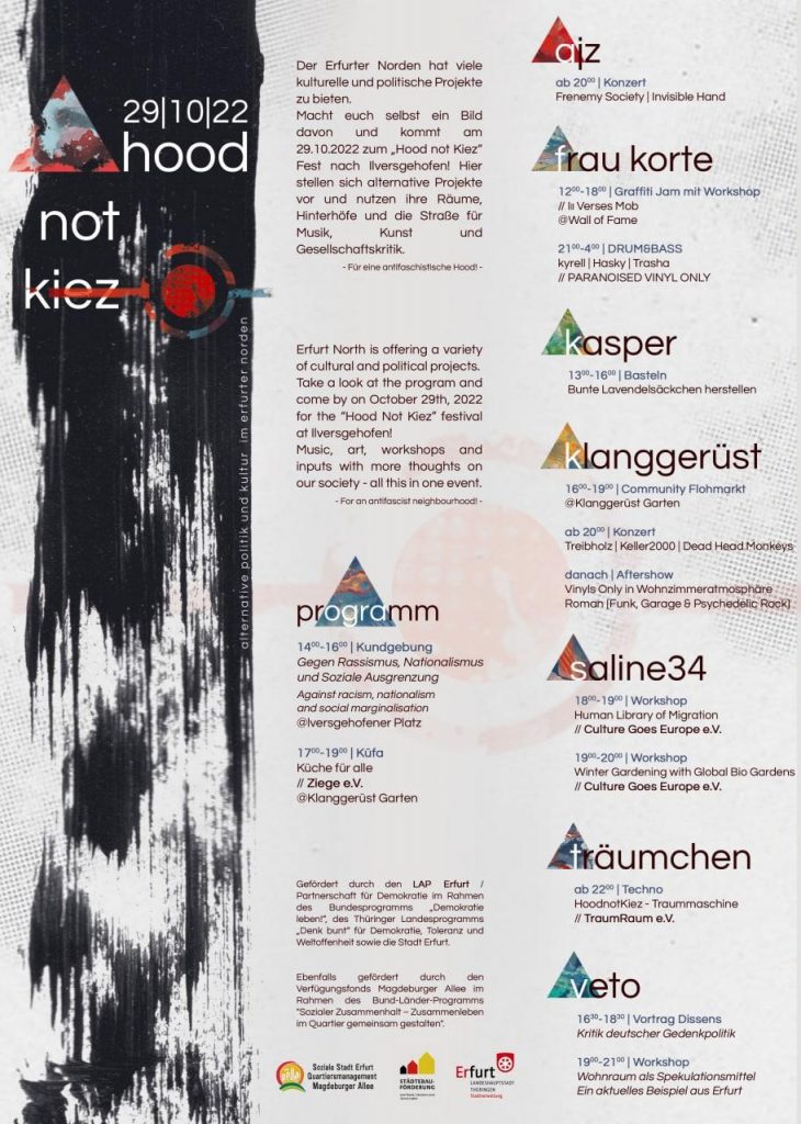 In Erfurt hat rechte und rassistische Gewalt Tradition. Rassistische Angriffe auf migrantisierte und rassifizierte Menschen haben die gleichen Kontinuitäten wie die Angriffe auf Linke, arme und marginalisierte Menschen. In den letzten Monaten haben lokale Nazis im Erfurter Norden mehrmals Leute angegriffen und verletzt. Dass das jetzt vermehrt in unserer Ecke der Stadt passiert, heisst nicht, dass das Problem neu (oder etwa ‘zugezogen’ ist) oder dass es schlimmer ist, als wenn andernorts Menschen rechte Gewalt erleben. Für uns ist Solidarität mit den Betroffenen rechter und rassistischer Gewalt (und miteinander) zwingend, notwendig und selbstverständlich. Die Angriffe betreffen auch uns, die sich hier für eine emanzipatorische Veränderung der Gesamtsituation einsetzen, jenseits von Verwertungslogiken, Verschönerung und Stadtteilentwicklung.