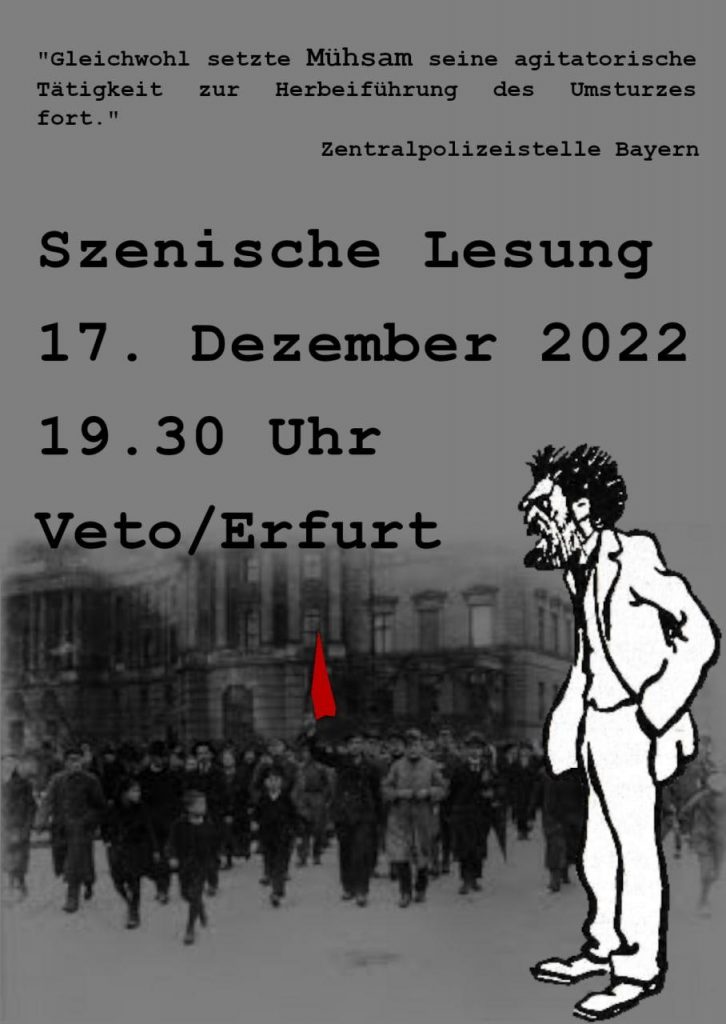 Am 17. Dezember führen Genoss:innen der sozialistischen Bewegung durch das Leben Erich Mühsams. Seine Geschichten, Gedichte und Polemiken sind zugleich künstlerische Produktionen als auch Sachberichte und Agitationen für den kommunistischen Anarchismus.