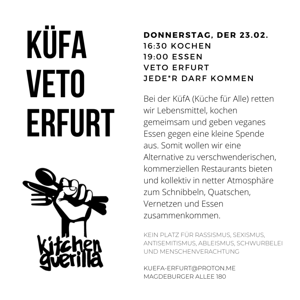 Diesen Donnerstag (23.02.) findet die nächste Küche für Alle im veto statt.