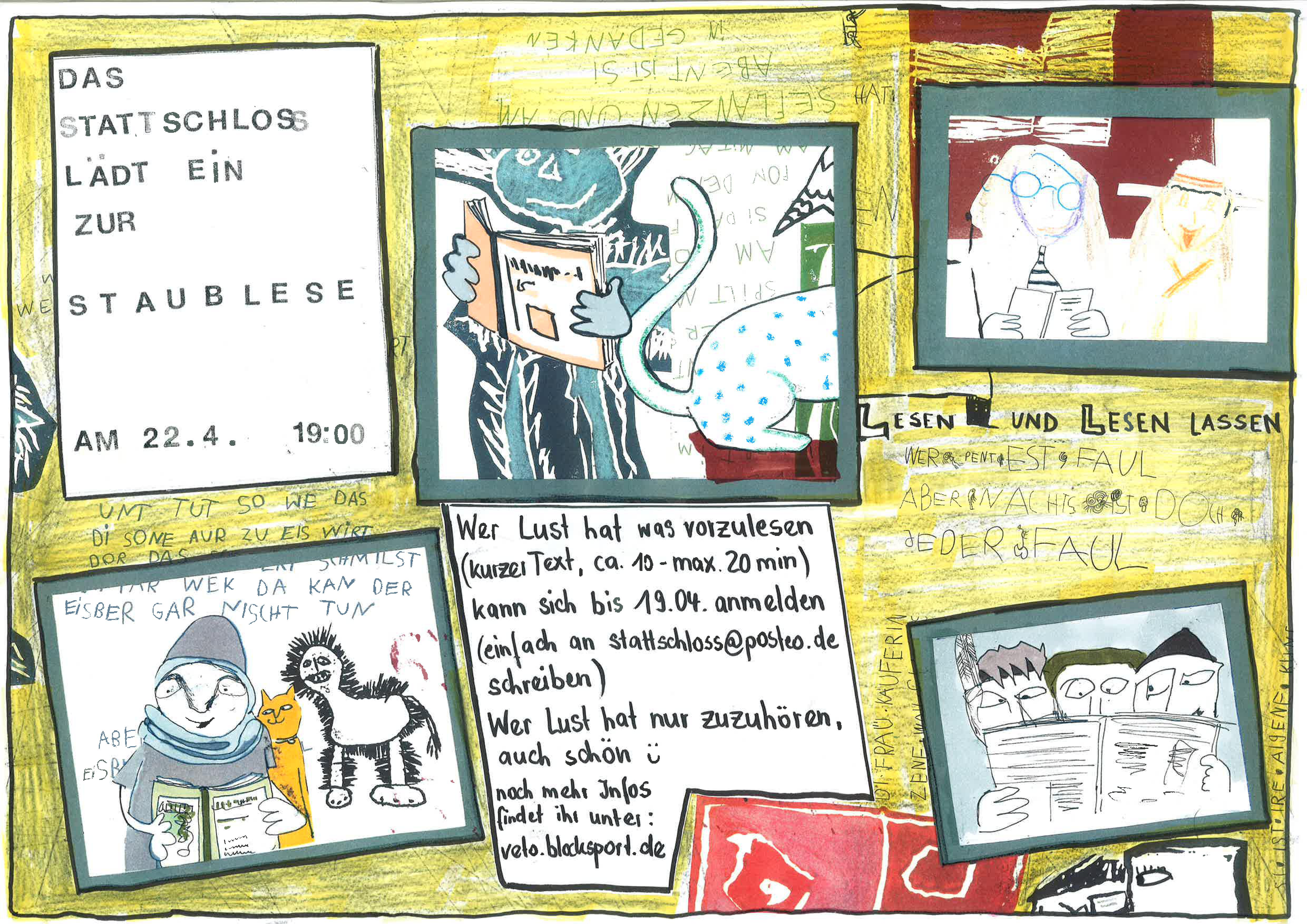Ein Roadtrip durch Epochen und Genres – macht es euch gemütlich, schnappt euch ein Getränk und schaltet den Livestream am 22.04. ab 19 Uhr ein, wenn wir aus unseren Lieblingsbüchern vorlesen. Versprecher garantiert! Da wir aber keine Lust auf Einseitigkeit haben und ja zwischendurch auch mal einen Stattschloss-Solischnaps trinken wollen, würden wir gern auch eure Lieblingstexte hören. Egal, ob Kinderbuch, Roman oder Sachbuch, wir freuen uns, wenn ihr euch traut und mit uns vorlest. Continue reading