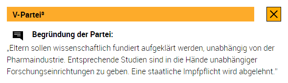 „Eltern sollen wissenschaftlich fundiert aufgeklärt werden, unabhängig von der Pharmaindustrie. Entsprechende Studien sind in die Hände unabhängiger Forschungseinrichtungen zu geben. Eine staatliche Impfpflicht wird abgelehnt.”