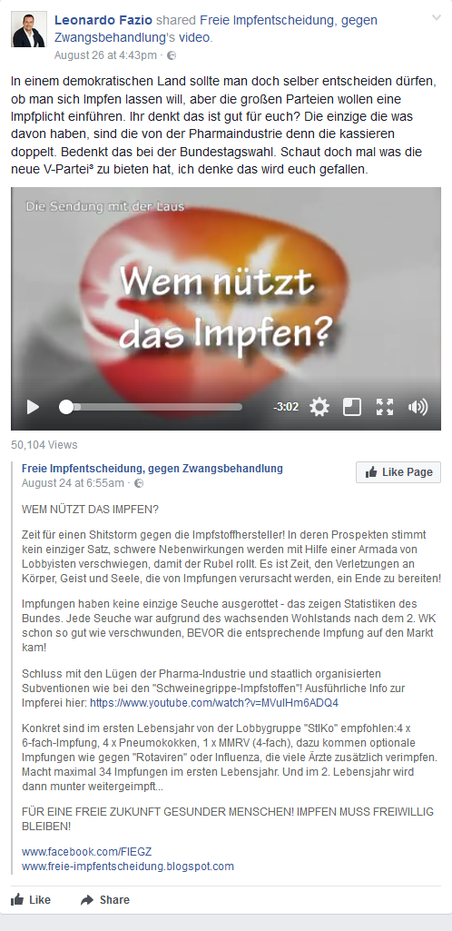 Leonardo Fazio ist Vorsitzender des V-Partei³ Landesverbands Hessen. Einen Monat vor der Bundestagswahl verbreitete Fazio auf seiner Facebookseite ein verschwörungstheoretisches Video einer Seite namens „Freie Impfentscheidung, gegen Zwangsbehandlung“. Der hessische Landesvorsitzende der V-Partei³ kommentierte das Video wie folgt: