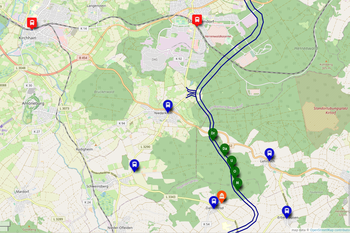 Wenn ihr mit Zug und Fahrrad vorbeikommen wollt, fahrt ihr am besten mit dem Zug nach Stadtallendorf. Nehmt den Ausgang nach links (ausgeschildert ist da u.a. „Niederkleiner Straße“) und folgt der großen Straße am Bahnhofsausgang (Niederkleiner Str.) nach links bis zum Ortsende. Dort beginnt links von der Landstraße ein Radweg, dem ihr bis Niederklein folgt. In Niederklein sucht ihr euch einen Weg zu dem Feldweg, der dann als Forstweg geradeaus durch den Wald geht (siehe Detailkarte Niederklein unten). Wenn ihr diesem Forstweg folgt, stoßt ihr irgendwann auf eine Landstraße, auf die ihr wieder links abbiegt und die nach Dannenrod führt. In Dannenrod geht es dann erneut links hoch zum Sportplatz und zum Waldrand. Die Fahrtzeit liegt zwischen 30 und 40 Minuten.