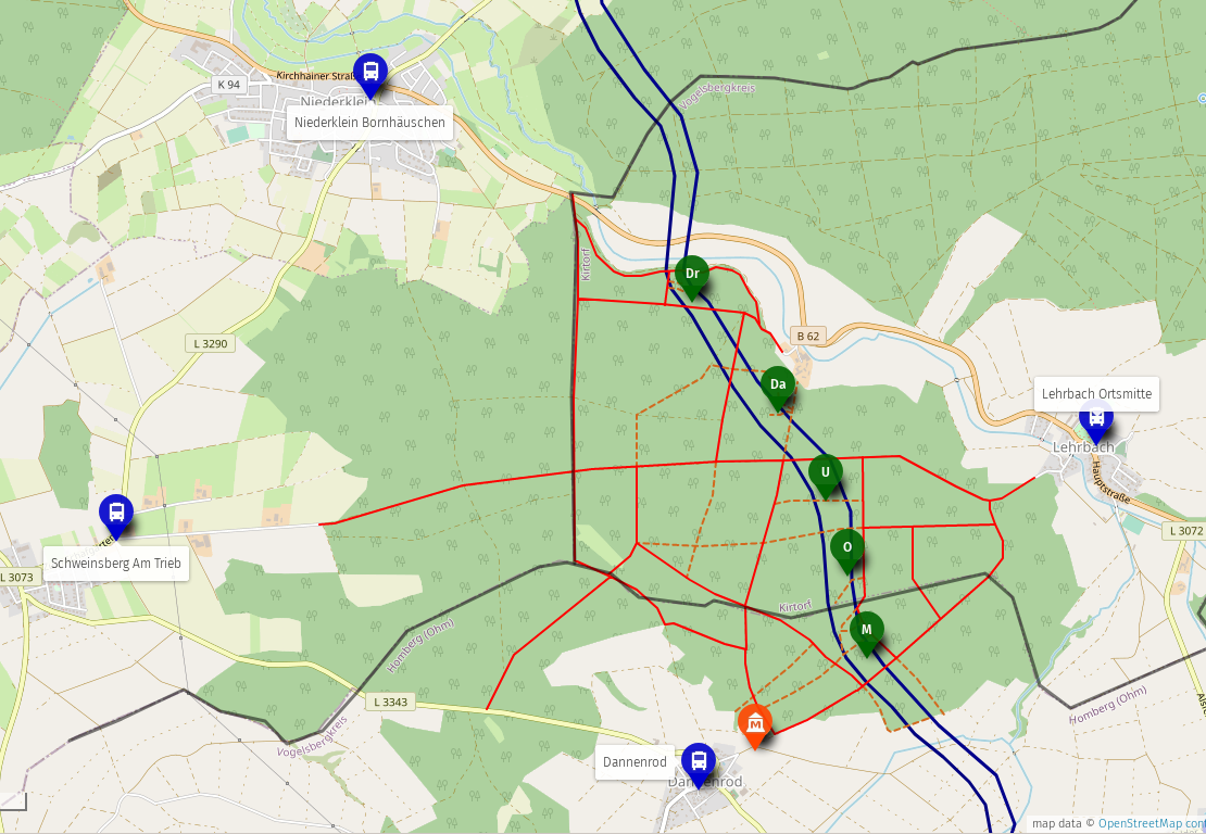 Es gibt die Bushaltestellen Homberg (Ohm)-Dannenrod in zwei Minuten Laufweite von der Mahnwache und Kirtorf-Lehrbach Ortsmitte auf der nordöstlichen Seite des Waldes