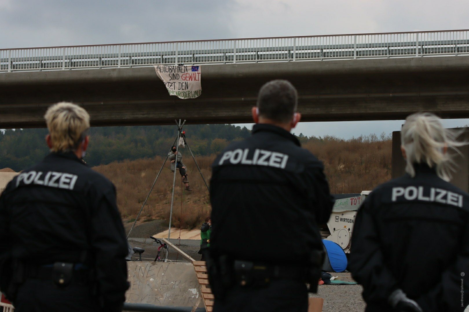 Direkt zum Start der Rodungssaison wurde der erste Baum gefällt und in Folge dessen Tag X ausgerufen. Der Herren(los)wald wurde von der Polizei geräumt und zu Teilen gerodet. Zwei Menschen blockierten erfolgreich einen Bagger. Parallel dazu wurde eine Autobahnbrücke der A5 in Solidarität mit dem Widerstand gegen die A49 blockiert. Deshalb musste die Autobahn für mehrere Stunden gesperrt werden! Etappensieg für uns.