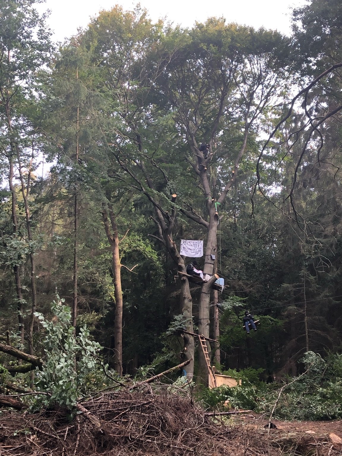 Der Herri wurde über Nacht erfolgreich wieder besetzt! Leider wurde diese Besetzung im Laufe des Tages geräumt. Von der Polizei wurde der Herri weiträumig abgesperrt und dennoch gelang es einer Kleingruppe einen Harvester zu blockieren. Die Rodungsarbeiten mussten daraufhin in diesem Bereich gestoppt werden. Die FFF-Demo von Stadtallendorf in den Herri war gut besucht, wurde jedoch am Herri von der Polizei gewaltsam gestoppt. Danach wurde es an der Stelle wieder friedlich, als die Protestierenden durch Jonglieren, Musik, und friedliches Schreien zeigten, dass es auch ohne Knüppel geht.