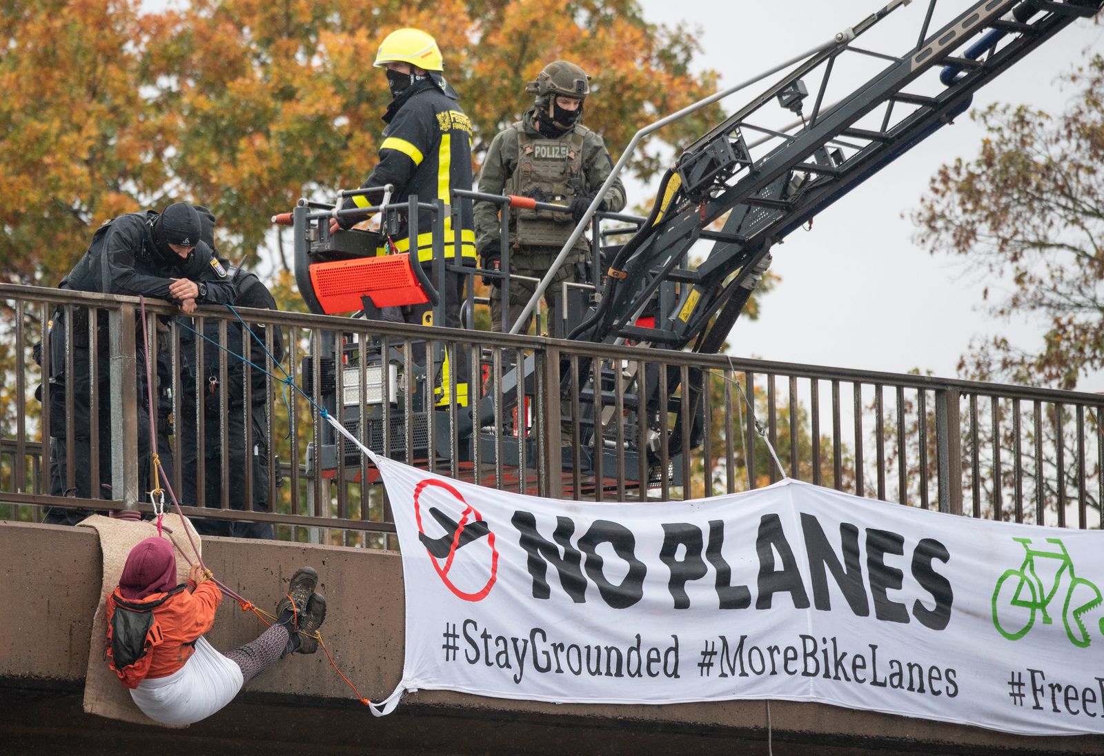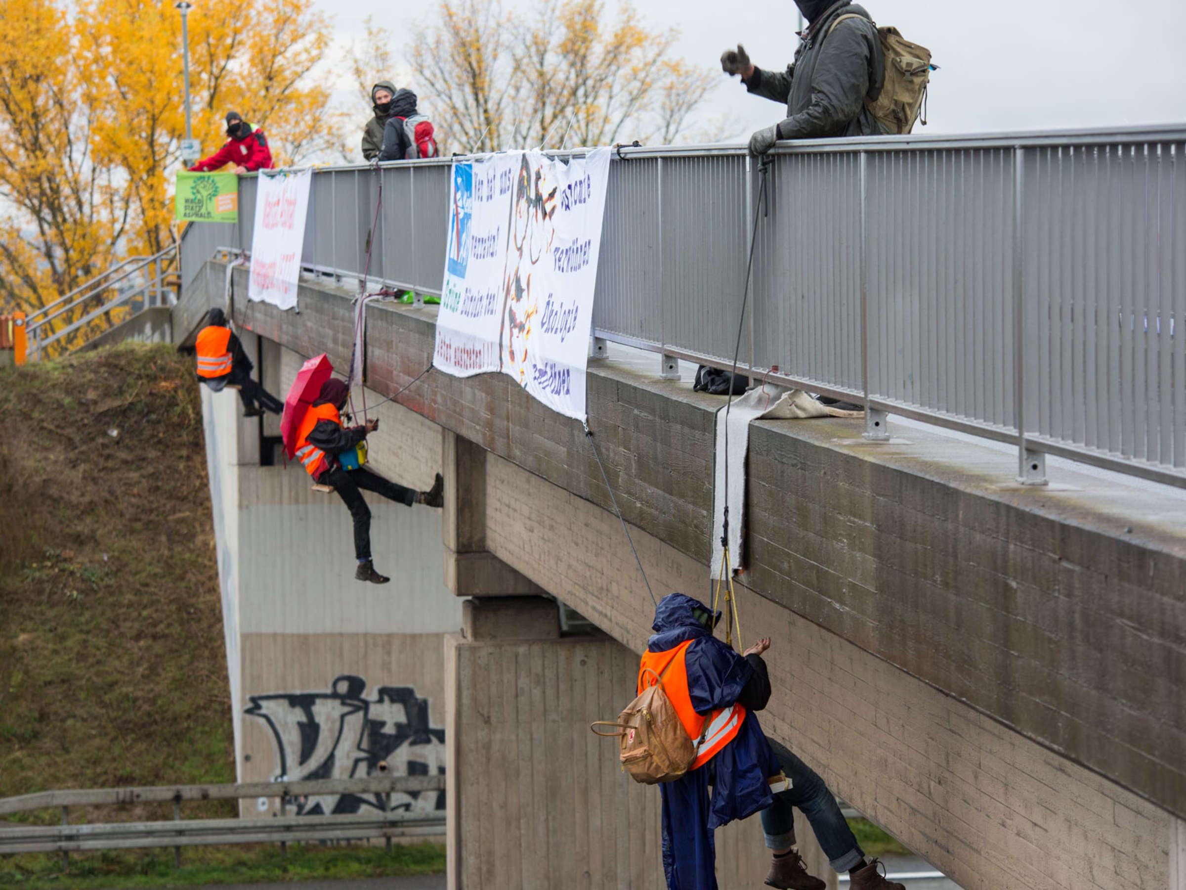 In den vergangenen Wochen waren bereits mehrfach auf der A5 und der A3 durch die Polizei kilometerlange Staus ausgelöst worden, als Kletter*innen geräumt wurden. Zeitgleich zu einer solchen Aktion ist es vor Kurzem zu einem Auffahrunfall mit einem Schwerverletzten am Ende eines Staus auf der A3 gekommen. Die AktivistInnen sehen die Ursache für diesen Unfall sowie die durchschnittlich 1053 Verletzten und 9 Toten pro Tag in dem Automobil-Verkehrssystem selbst. Seit 2012 sind deutschlandweit die Zahlen der tödlich verunglückten Verkehrsopfer relativ stabil mit über 3000 verlorenen Menschenleben pro Jahr. Kai M., ein Teilnehmer der Aktion, meint dazu: „Wir engagieren uns für eine sozialgerechte und klimaschonende Verkehrswende. Wer einen sichereren Straßenverkehr will, sollte zusammen mit uns für autofreie Städte und Gemeinden, für besseren und kostenfreien ÖPNV, für Fahrradstraßen und Barrierefreiheit eintreten.“