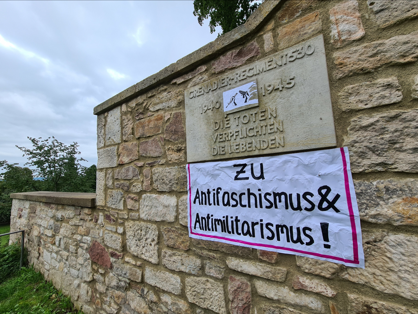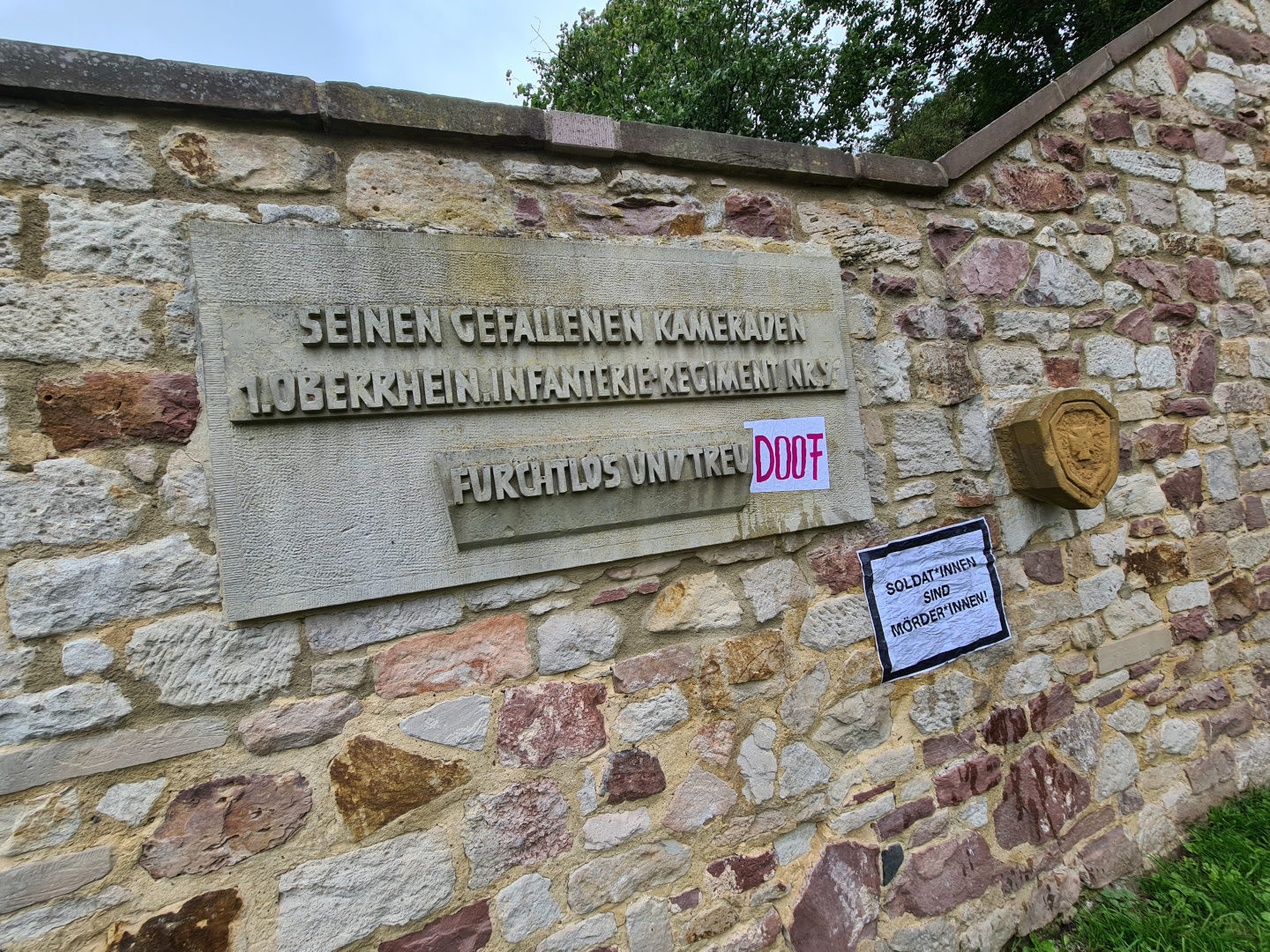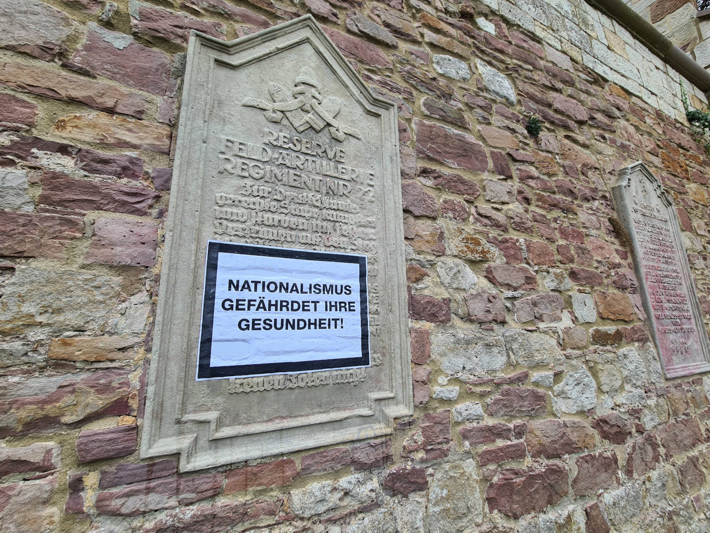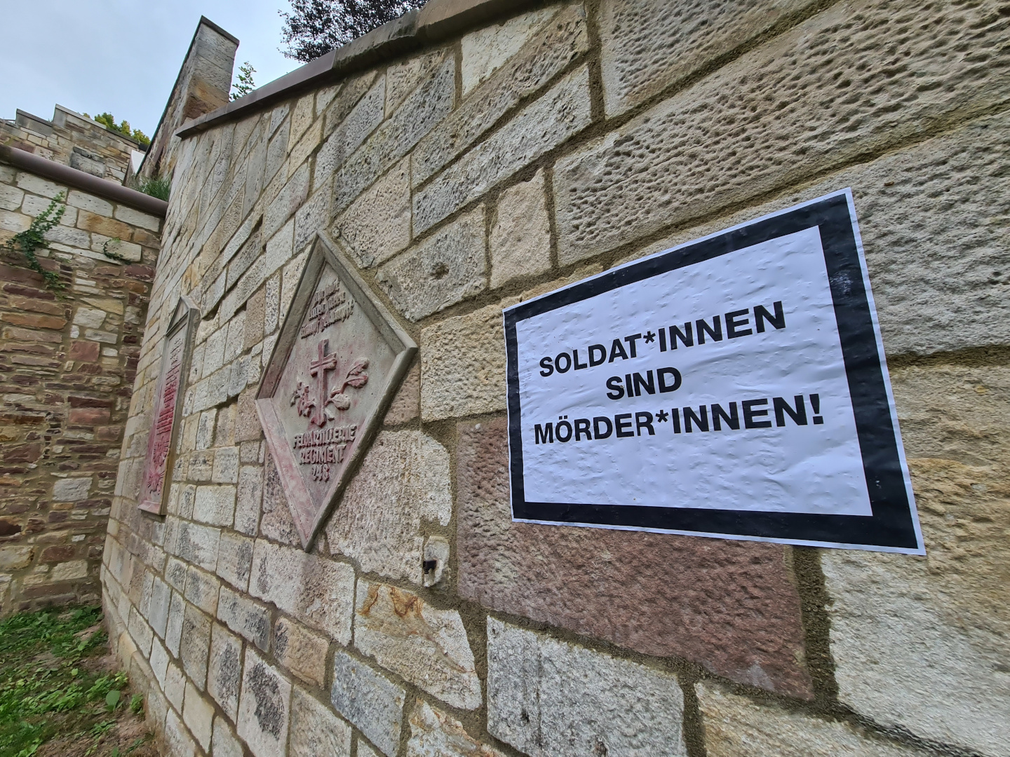 Eine Einordnung dieses ideologischen Mülls gibt es auf dem „Ehrenmal“ erst jetzt durch die Plakataktion. Auf 40 Warnhinweisen steht nun überall auf dem Denkmal „Soldat*innen sind Mörder*innen“ und „Nationalismus gefährdet Ihre Gesundheit“. Die Plakette „1940-1945: Die Toten verpflichten die Lebenden“ ergänzten die Aktivist*innen mit: „zu Antimilitarismus und Antifaschismus“. Soldat*innen sind nicht mehr „furchtlos und treu“, sondern „furchtlos und treudoof“.
