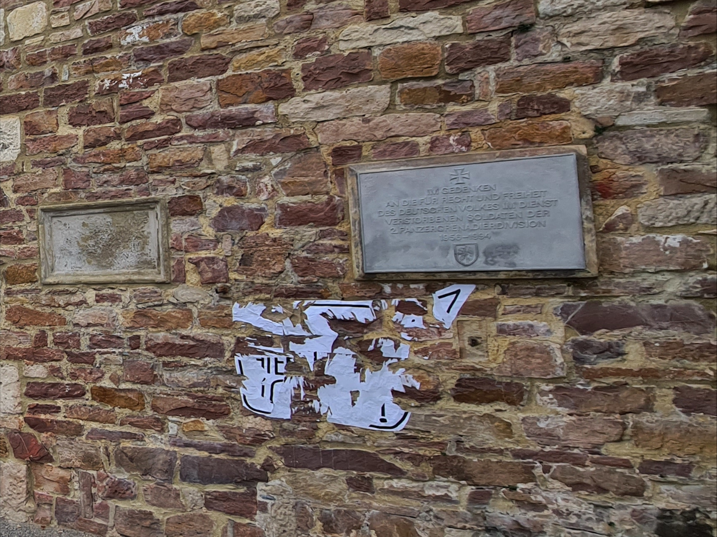 All das schien die Bundeswehr nicht zu stören, als sie beschloss, ihre eigene Plakette im Denkmal aufzuhängen, um ihren zwischen 1956 und 1994 „für Recht und Freiheit des deutschen Volkes im Dienst verstorbenen Soldaten der 2. Panzergrenadierdivision“ zu gedenken. „Die Bundeswehr sieht sich ganz offensichtlich in der Tradition des Deutschen Heeres und der Wehrmacht“, erklärt Wolfgang Kleisteran: „Deswegen haben wir hier für diese Plakette auch eine extra Sprechblase gebastelt. Auf der Stand: ‚Nazidenkmal? Hier pass ich hin!‘ Noch in den frühen Morgenstunden wurde sie von fleißigen Deutschen in mühsamer Fummelarbeit bis zur Unlesbarkeit abgerissen.“