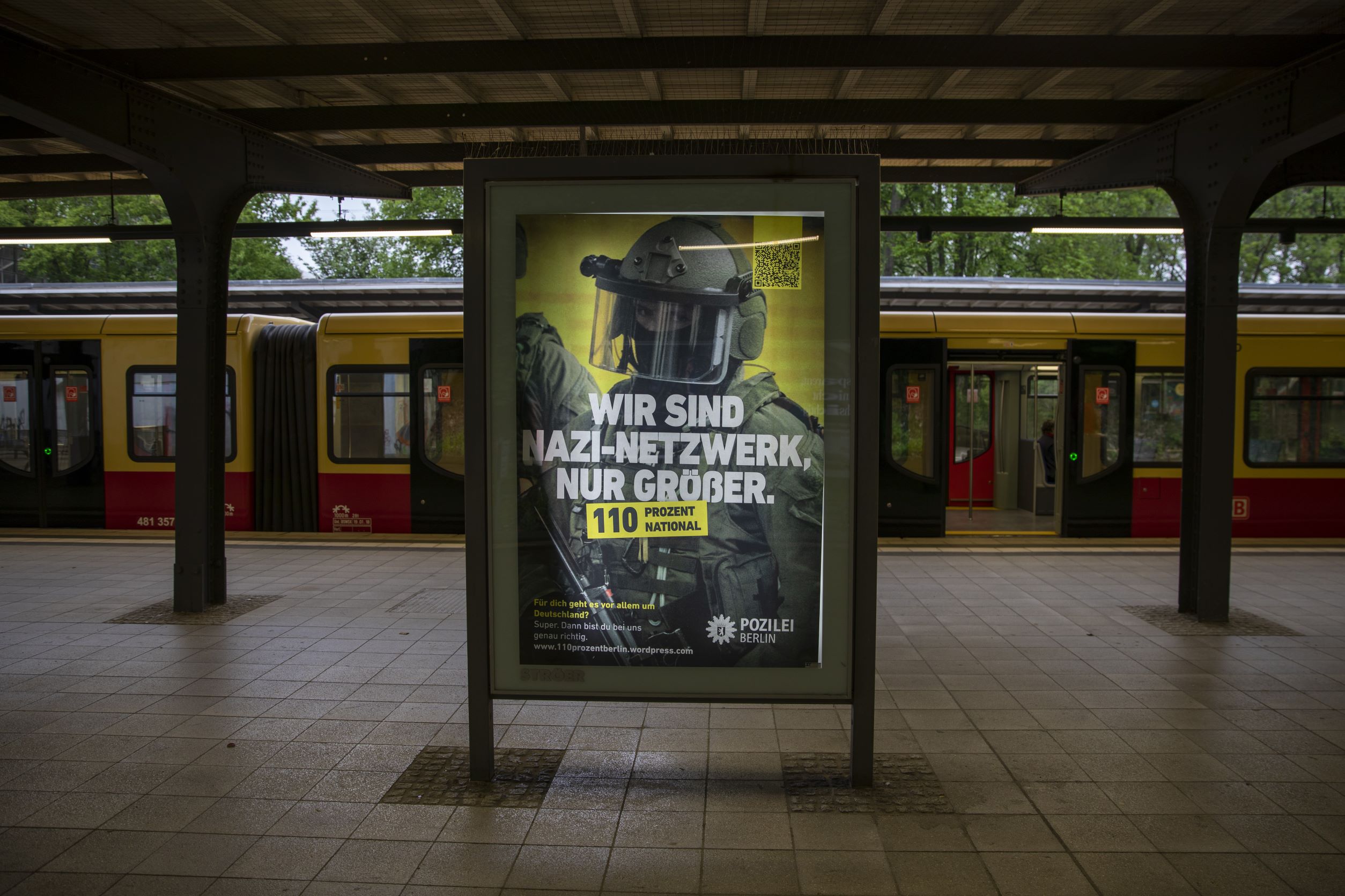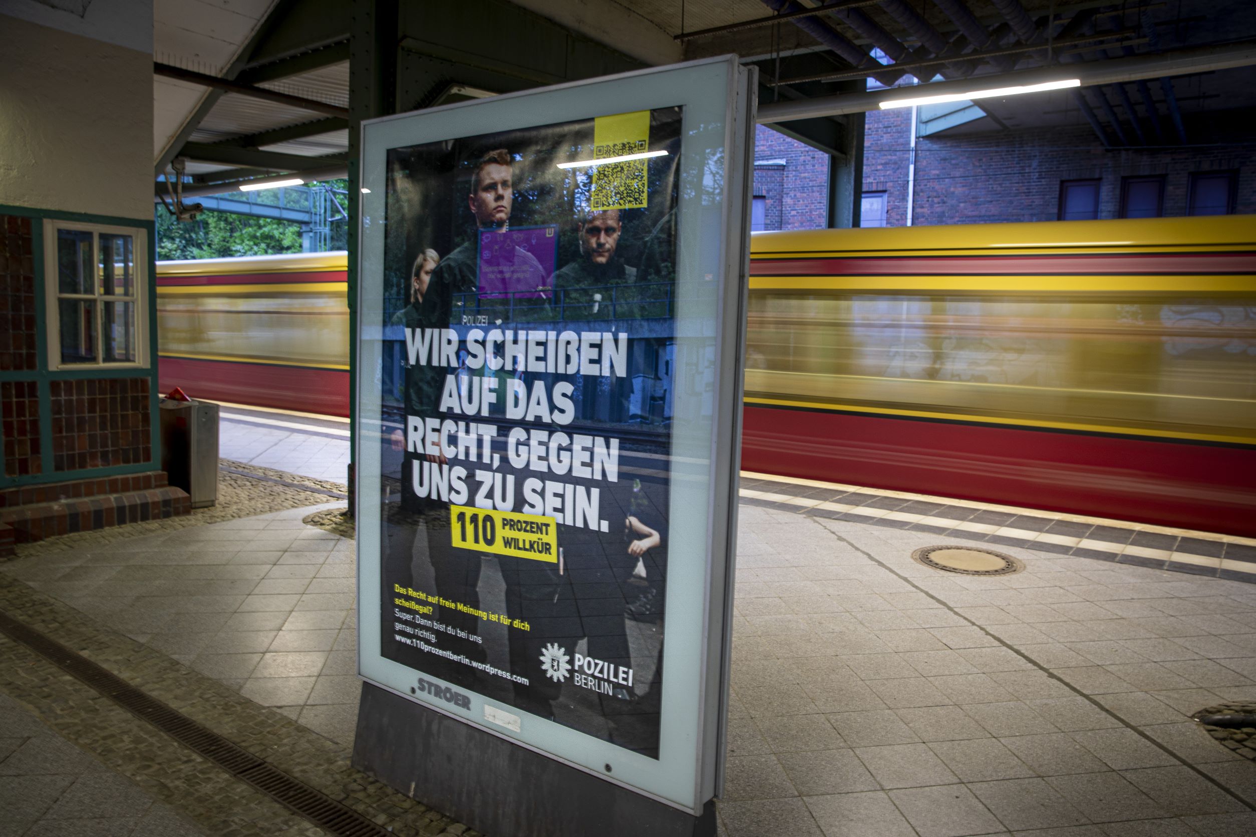 Da staunten die zum Polizeikongress angereisten Schergen, Chargen und Geheimen nicht schlecht: Rund um den Veranstaltungsort an der Messe und im gesamten Nahverkehr in der Berliner Innenstadt begegneten ihnen gefälschte Werbeposter der Polizei. Statt platten Propaganda-Sprüchen kritisieren die Poster die staatlich bezahlten Gewalttäter*innen: „Wir sind Nazi-Netzwerk, nur größer. 110% national“ und „Wir scheißen auf das Recht, gegen uns zu sein. 110% Willkür“ kann man auf den Postern lesen. Außerdem erklären sie folgendes: „Das Recht auf freie Meinung ist für dich scheißegal? Super. Dann bist du bei uns genau richtig.“ und „Für dich geht es vor allem um Deutschland? Super. Dann bist du bei uns genau richtig.“ Ganz böse: Die Poster tragen ein Wappen und die Wortmarke „Pozilei Berlin.“