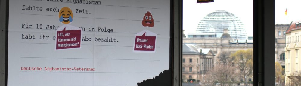 Die ersten der Überkleber sind in freier Wildbahn aufgetaucht! In Berlin macht der Bundeswehrverband im Bahnhof Friedrichstraße gerade Werbung für sich selbst. Mit einem großen Poster wirbt der Soldat*innenverein für mehr Anerkennung für Veteran*innen. Doch mit einer Adbusting-Aktion verderben Antimilitarist*innen der Gruppe „Veteranen Busten“ den Militärs den Spaß. Auf dem Poster sind nun zwei Smileys mit Sprechblase. Ein Lach-Smiley sagt passenderweise: „Lol! Was kümmern Menschenleben?“ Und ein Kacke-Smiley sagt: „Brauner Nazi-Haufen!“
