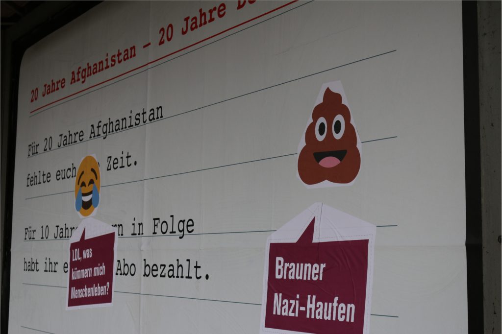 Auf Indymedia schreibt die Gruppe folgendes: Veteran*innen sind Leute, die für viel Geld in Kriegen wie Afghanistan mitgemacht haben. Allein am 4. September 2009 ließ die Bundeswehr mit einem Bombenanschlag mindestens 91 Menschen ermorden, ohne dass die verantwortlichen Offiziere je Konsequenzen dafür spürten. Wie viele Menschen die Bundeswehr insgesamt in Afghanistan tötete, ist unbekannt bis geheim. Und für das gut gezahlte Rummorden wollen die Bundis jetzt auch „Respekt“. Da passt der Lol-Smiley doch wie Faust aufs Auge.
