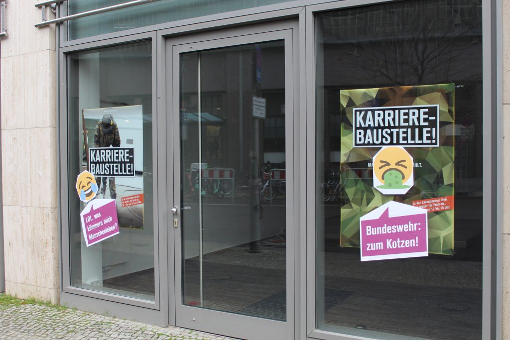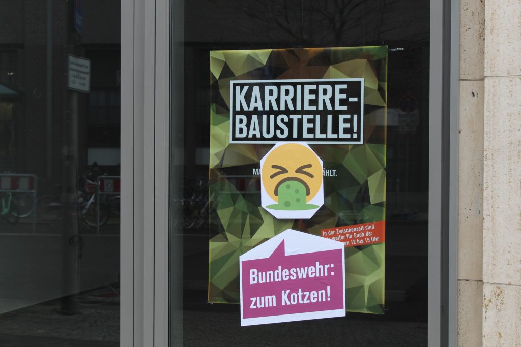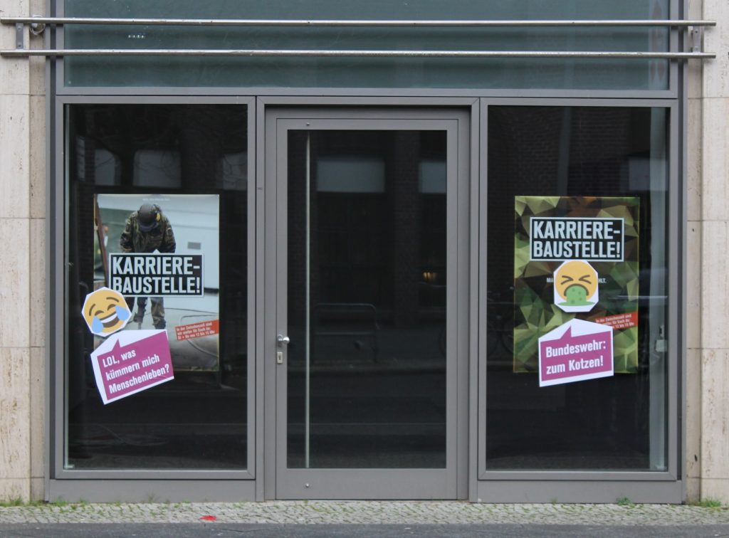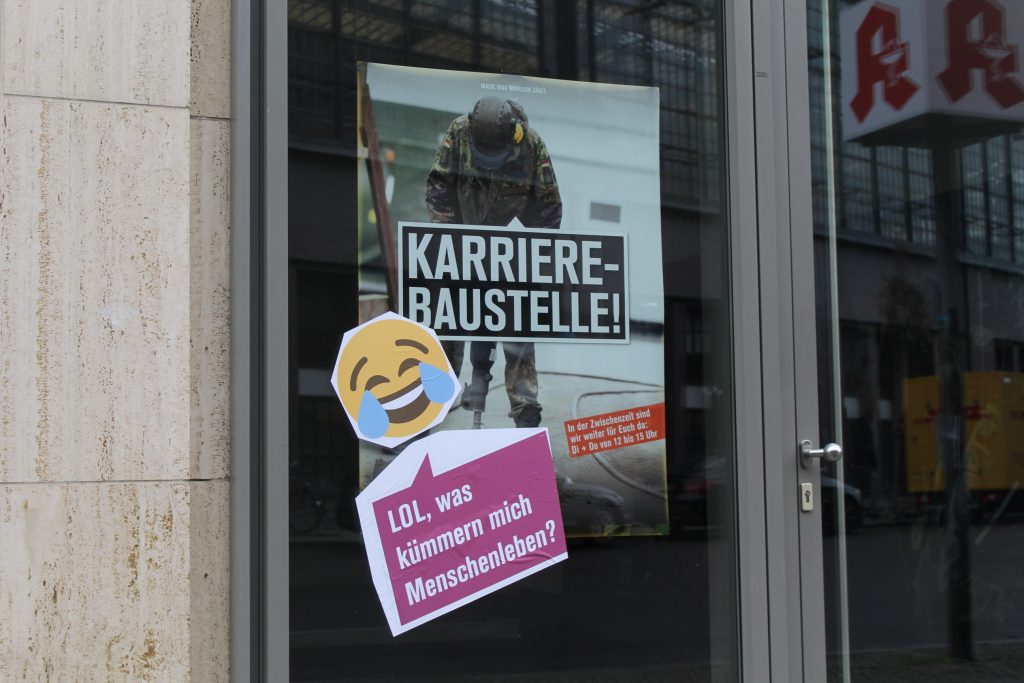 Aber wir fanden, die machen sich auch wunderschön am Bundeswehr-Werbeladen. Auf den in den Fenstern des Ladens angebrachten Werbeplakaten sieht man nun einen großen Kotz-Smiley mit einer Sprechblase. In der Sprechblase steht: „Bundeswehr zum Kotzen!“ Auf dem anderen Fenster klebt ein großer Lachsmiley. Er sagt: „Lol, was kümmern mich Menschenleben?“