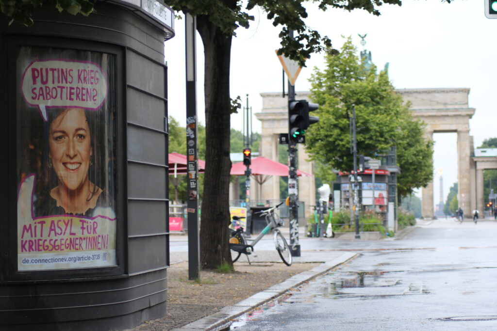 „Mit dem Werbe-Plakat stimmt doch was nicht?“ Das dachten sicher sich heute auch Passan*tinnen, die durch Berlins Mitte flanierten. Denn die Kommunikationsguerilla-Gruppe „Asyl für Kriegsdienstverweiger*innen jetzt!“ (AfKj!) kaperte unerlaubt fast 20 Werbeplakate zwischen Treptower Park, Alexanderplatz und Tiergarten. Die aktuell hängenden Werbeplakate für Eiscreme, Zeitschriften, einen Freizeitpark, Berliner Verkehrsbetriebe, Duschgel oder Kleidung veränderte die Gruppe „AfKj!“ mit Schere, Papier oder Farbe so, dass die abgebildeten Personen und Motive jetzt dafür werben, Kriegsdienstverweigerer*innen aus Russland, der Ukraine und Belarus einfacher Asyl zu gewähren. „Die meisten Werbemotive sind derart platt, dass man sie sich einfach mit einer anderen Forderung wie Recht auf Asyl für Kriegsdienstgegner*innen aneignen kann!“ sagt Roderich Supersonnenwetter, Sprecher*in der Aktionsgruppe „Asyl für Kriegsdienstverweiger*innen jetzt!“ (AfKj!). Außerdem findet sich auf allen Plakaten ein Link und ein QR-Code, der zur Homepage der Kriegsdienstverweigerungsorganisation Connection e. V. führt.