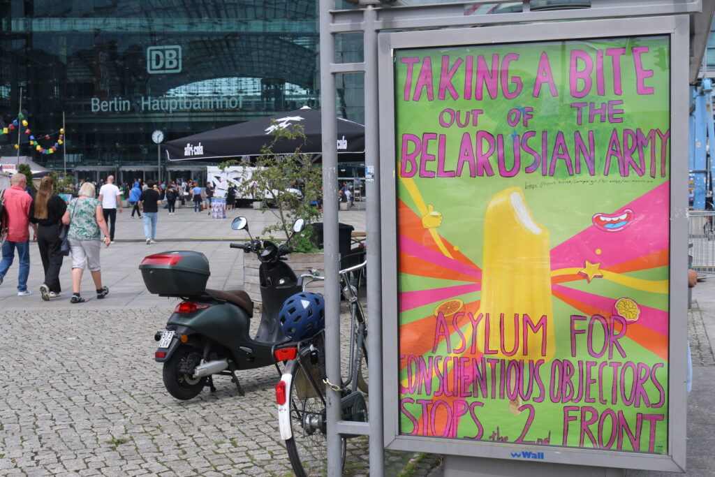 A poster showing a bitten ice-cream now advertises asylum for Belarusian conscientious objectors: “Taking a bite out of the Belarusian army. Asylum for conscientious objectors stops the second front!”