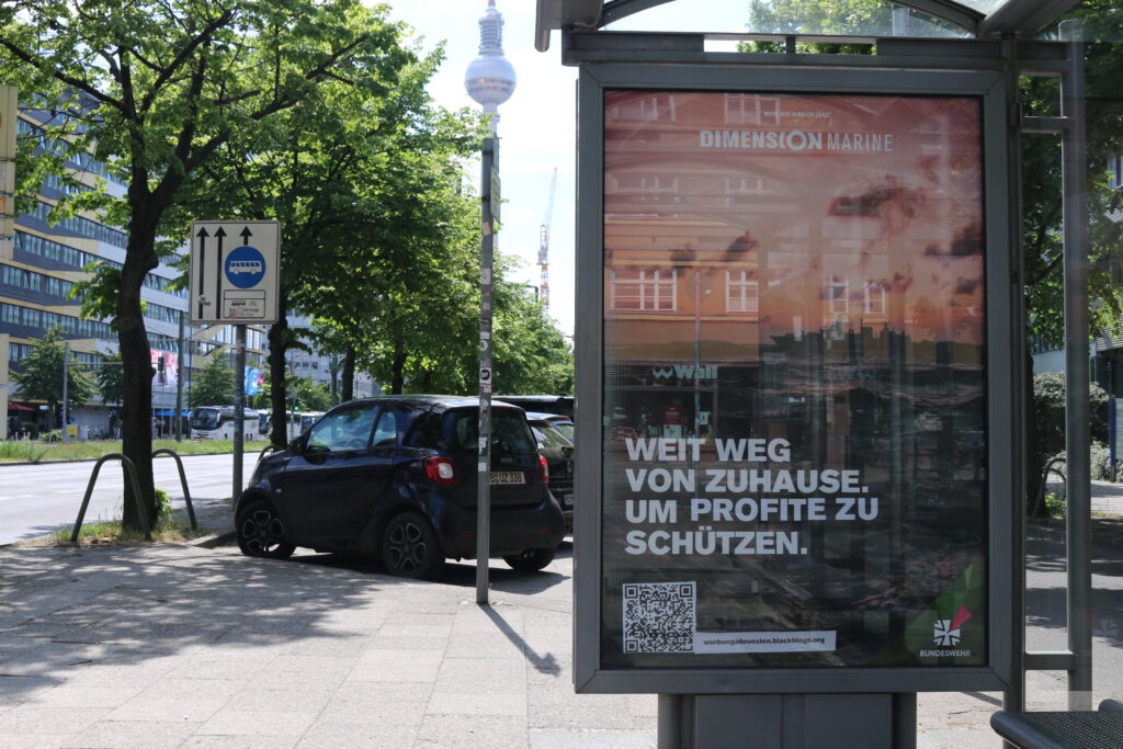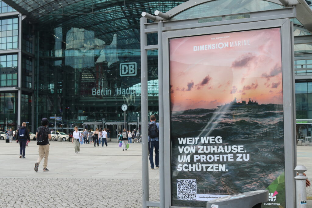 Ebenfalls zur Abbildung eines Kriegsschiffes schreibt die Bundeswehr im Original: „Weit weg von Zuhause. Um es zu schützen.“ Die nun in der Stadt hängende veränderte Variante lautet: „Weit weg von Zuhause. Um Profite zu schützen“.