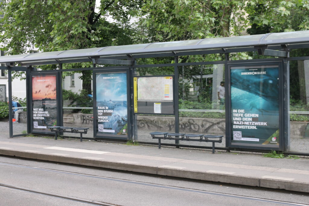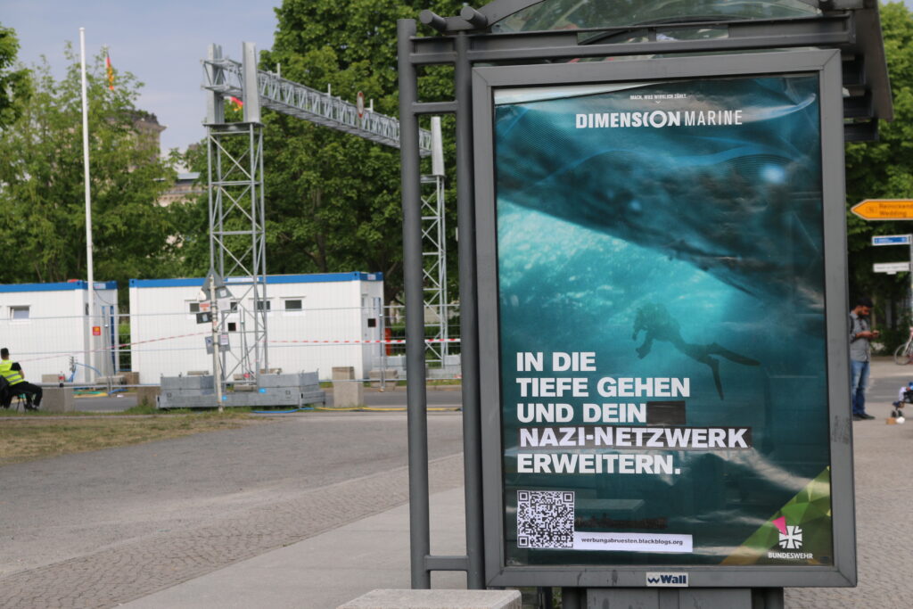 Die Poster der Marine zeigen die Silhouette einer Taucher*in im Wasser. „In die Tiefe gehen und den Horizont erweitern“, schreibt die Bundeswehr dazu (und übersieht, dass der Horizont unter Wasser verringert wird). Auf den veränderten Plakaten heißt es: „In die Tiefe gehen und dein Nazi-Netzwerk erweitern.“