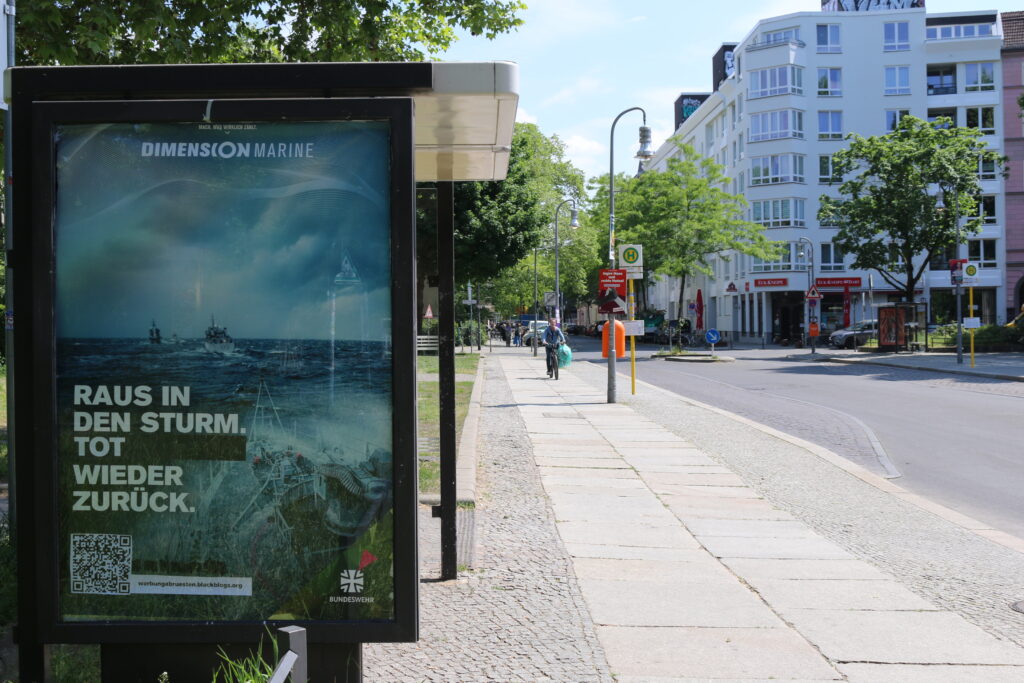 Huch, sind diese Bundeswehrplakate nicht irgendwie merkwürdig?“ Das dürften sich viele Passan*tinnen in Berlin über das Feiertagswochenende gefragt haben. Denn das Kommunikationsguerilla-Kollektiv „Schiffe versenken“ nutzte den Feiertag, um sich fast 70 Werbeplakate der Bundeswehr unerlaubt aus den Werbevitrinen in Bushaltestellen und Bahnstation auszuleihen. Die Aktivist*innen spekulierten erfolgreich darauf, dass die Werbefirmen wegen des Feiertages das ganze Wochenende nicht in der sein würden, die manipulierten Plakate zu entfernen. Mit Überklebern kehrten die Aktivist*innen mittels kleiner Veränderungen der Slogans die ursprüngliche Botschaften in ihr Gegenteil. „Mit kleinen Änderungen an den Slogans haben wir verdeutlicht, worum es beim Beruf der Soldat*in wirklich geht“ erklärt Marie Neweg, Sprecher*in der Gruppe „Schiffe versenken“: „Ums Töten, Sterben, das Gründen von Nazi-Preppergruppen und das Durchsetzung deutscher Profitinteressen.“