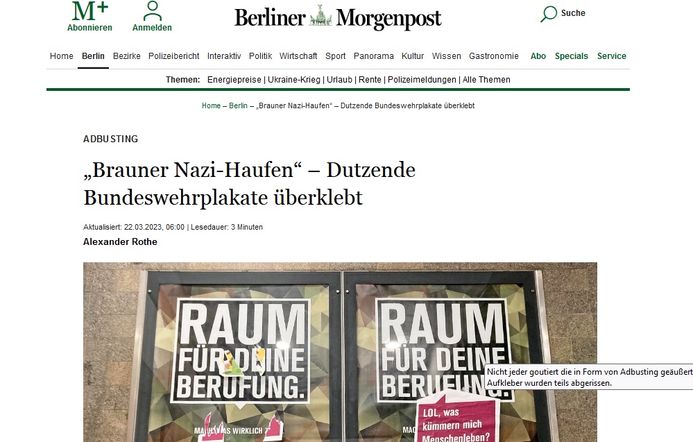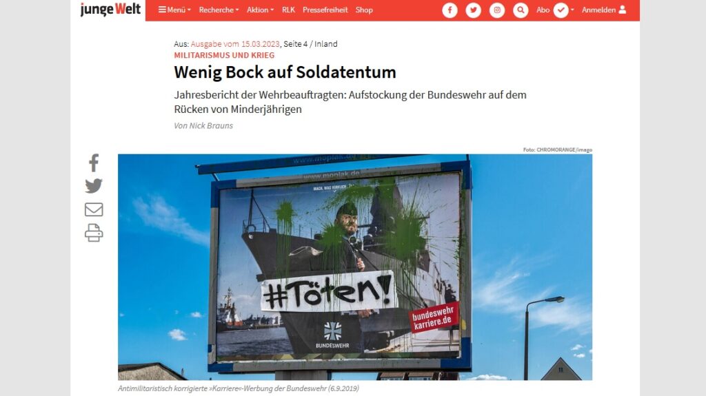 In der Jungen Welt schreibt heute Niklas Brauns über den Jahresbericht der Wehrbeauftragten und die Aufstockung der Bundeswehr auf dem Rücken von Minderjährigen. Die Bundeswehr habe 500 Leute weniger als letztes Jahr, beim Bewerberaufkommen sei ein Einbruch von rund elf Prozent »erheblich«. Gleichzeitig stieg die Anzahl der Anträge auf Kriegsdienstverweigerung von 209 Anträgen im Jahr 2021 auf 1.123 an. Der Text ist mit einem schönen Adbusting bebildert.