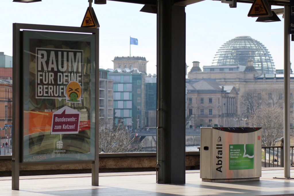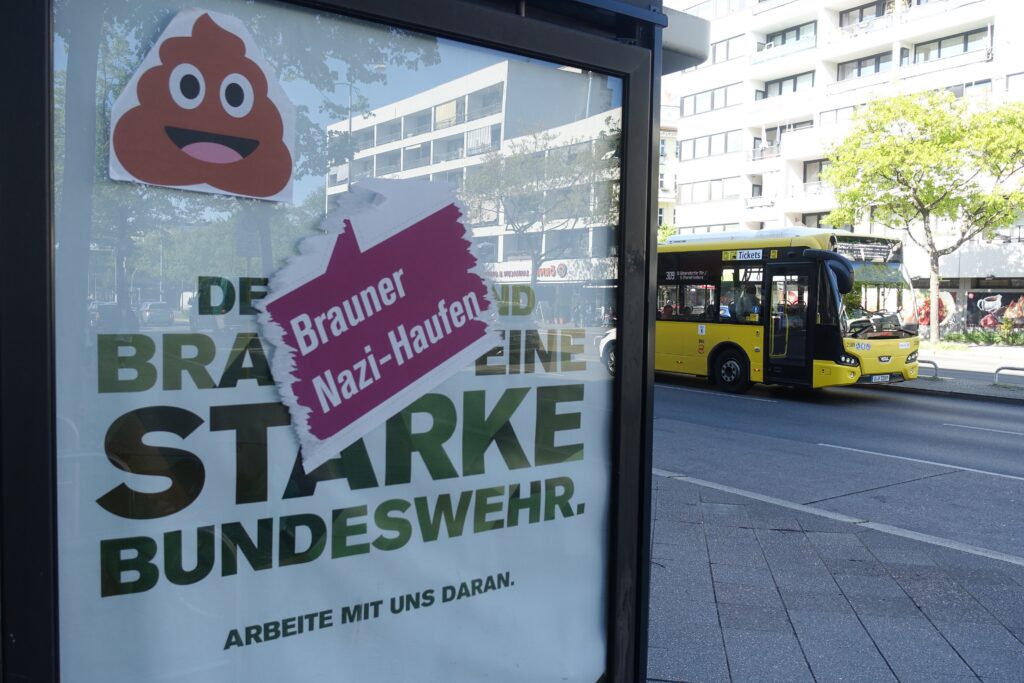 Kaum macht die Bundeswehr nach langer Pause wieder Werbung in Berlin, wird sie auch schon in der Öffentlichkeit kritisiert. In Charlottenburg, Neukölln, Schöneberg und Treptow tauchten auf den Werbepostern des Militärs unautorisierte Aufkleber auf. So kommentierten Unbekannte die Slogans mit Kacke- und Kotz-Smileys sowie Sprechblasen mit Kritik am Militär. Die Aufkleber stammen von der Kampagne „Werbung abrüsten!“ Deren Sprecher*in Yver Cleber sagt: „So werden die Millionen im Propaganda-Etat der Bundeswehr dank Aufklebern für ein paar Euro zum Bumerang!“