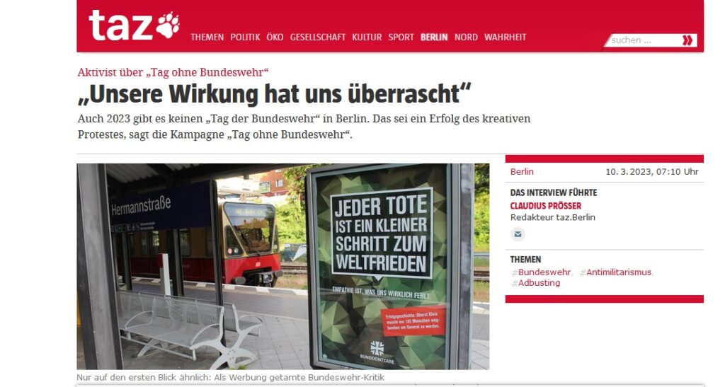 Für die taz hat Claudius Prösser ein Interview mit Aktivist*innen geführt. Die Aktivist*innen haben mit Kreativ-Protest den „Tag der Bundeswehr“ aus Berlin vertrieben. Das Interview im Original und bei uns: