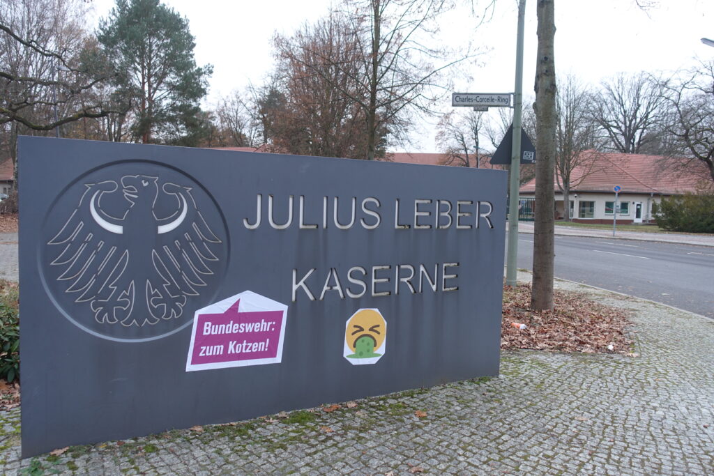 Erneut gibt es einen Beitrag der Gruppe a.a.k. (Antimilitaristischer AdventskalendA), die in unregelmäßigen Abständen Liegenschaften der Bundeswehr in Berlin besucht und darüber auf Indymedia berichtet. Diesmal wurde der Amtssitz des evangelischen Militärbischof etwas kommentiert. Neben seinem Amtsschild seiner Amtsstube am Jebensstr 3 in Berlin sieht man nun einen großen Kotz-Smileys mit einer Sprechblase. In der Sprechblase steht: „Bundeswehr zum Kotzen!“