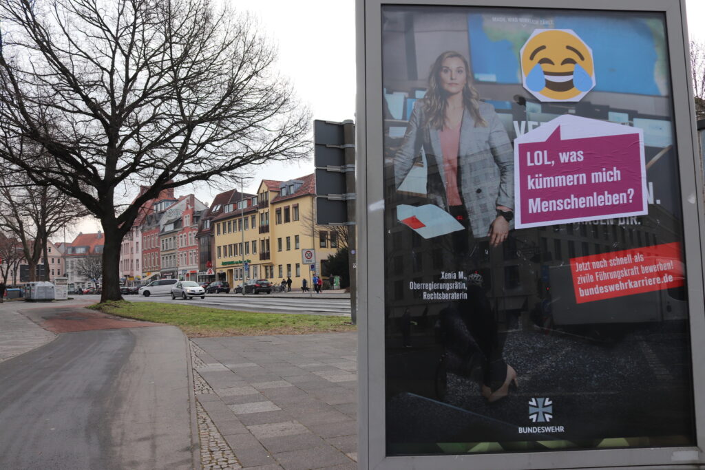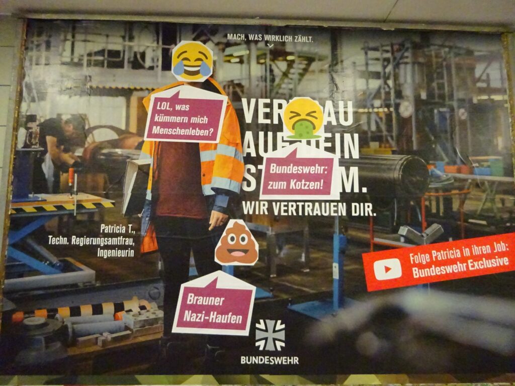 In Berlin hängen seit einigen Tagen Poster im Megalight-Format für die aktuelle YouTube-Serie auf dem Kanal „Bundeswehr Exclusive“. Prompt nutzten Berliner Aktivist*innen unsere Großformat-Aufkleber, um die Megalights zu Anti-Bundeswehr-Postern umzugestalten. In diesem Text erfährst du alles wissenswerte, um ihrem Beispiel folgen zu können.