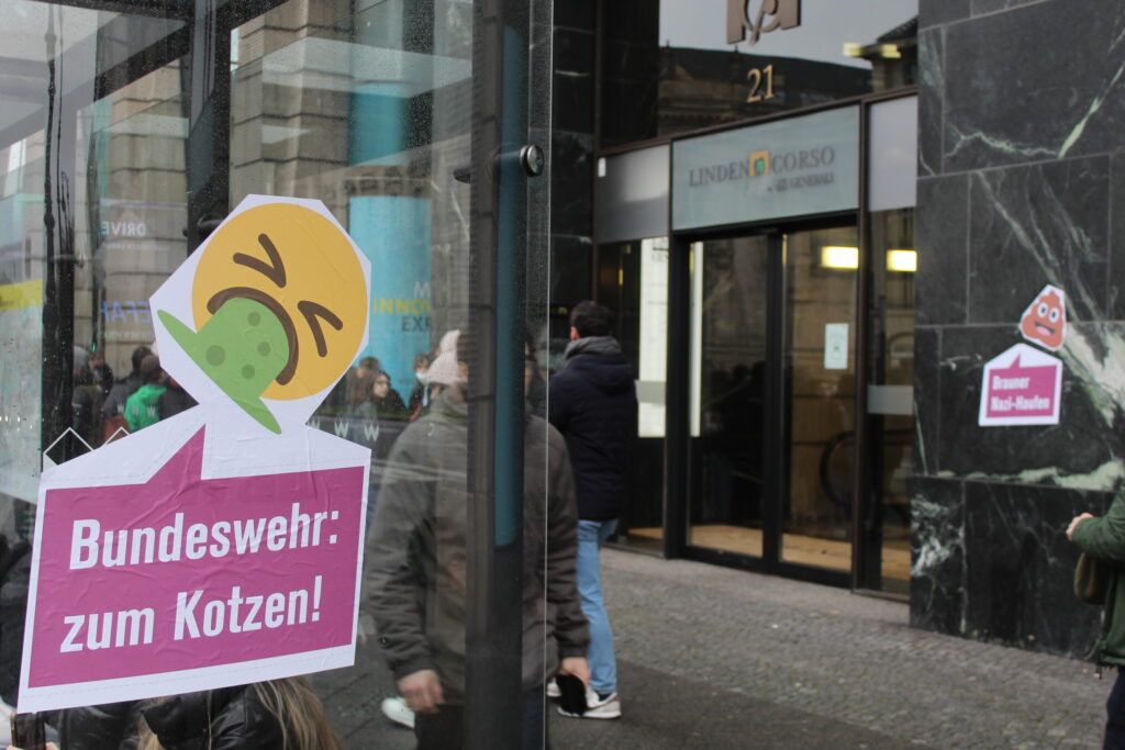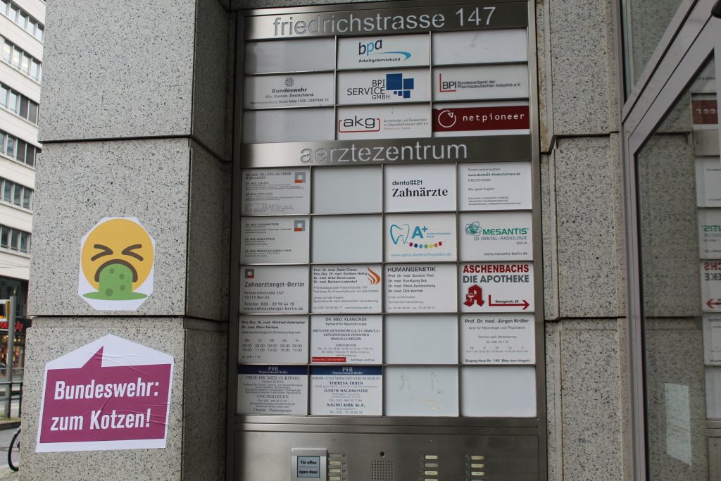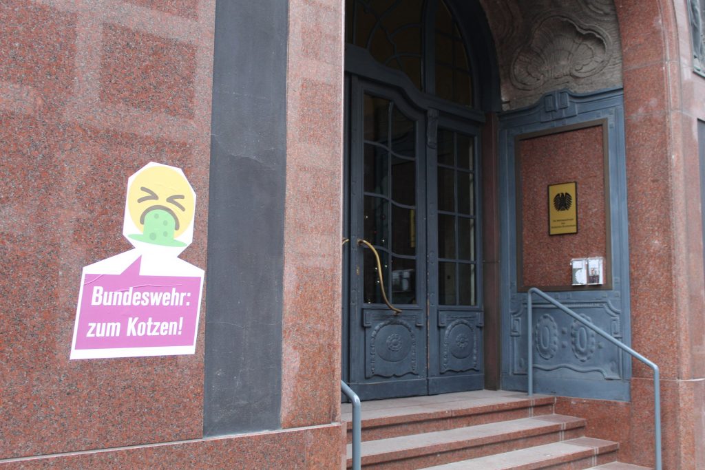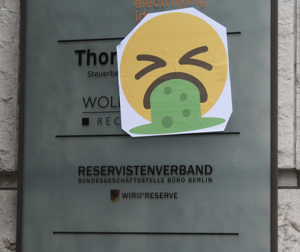 Auch andere Aktivist*Innen machen Gebrauch der Antimilitaristischen Aufkleber. So erreichte uns der Bericht einer Aktion an der Universität Potsdam der auf Indymedia veröffentlicht wurde. Das Büro vom Kriegsfetischist und Wehrmacht-Tollfinder Doktor Sönke Neitzel an der Universität Potsdam wurde verschönert.Die Tür seines Büros und die des Lehrstuhls für Militärgeschichte wurde mit einem Kotz-Smiley und einer Sprechblase versehen. In der Sprechblase steht „Bundeswehr: zum Kotzen!“