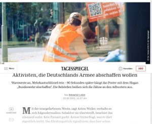 Der Tagesspiegel widmet sich auf gleich zwei Seiten in der Wochenendausgabe vom 22.10.2023 dem Thema Bundeswehr-Werbung. Sebastian Leber schreibt über „Mit Fake-Werbeplakaten gegen die Bundeswehr: Die Aktivisten, die Deutschlands Armee abschaffen wollen“. Er berichtet: „Warnweste an, Mehrkantschlüssel rein – 90 Sekunden später hängt das Poster mit dem Slogan „Bundeswehr abschaffen“. Die Behörden beißen sich die Zähne an den Adbustern aus.“