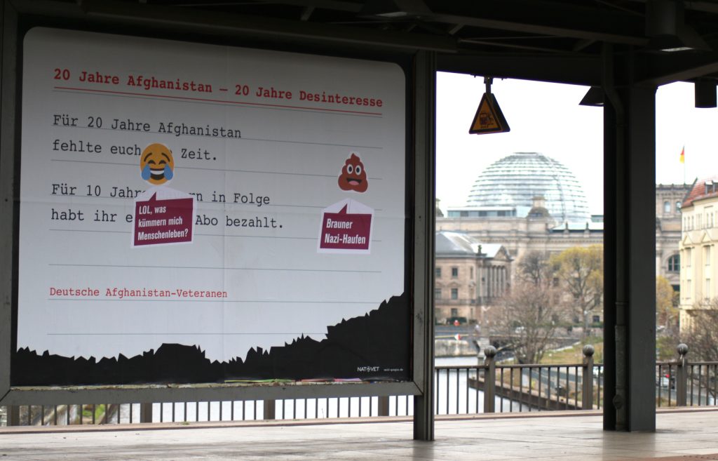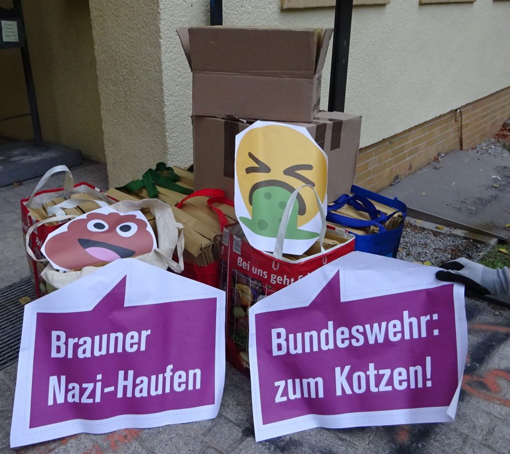 Die ersten der Überkleber sind in freier Wildbahn aufgetaucht! In Berlin macht der Bundeswehrverband im Bahnhof Friedrichstraße gerade Werbung für sich selbst. Mit einem großen Poster wirbt der Soldat*innenverein für mehr Anerkennung für Veteran*innen. Doch mit einer Adbusting-Aktion verderben Antimilitarist*innen der Gruppe „Veteranen Busten“ den Militärs den Spaß. Auf dem Poster sind nun zwei Smileys mit Sprechblase. Ein Lach-Smiley sagt passenderweise: „Lol! Was kümmern Menschenleben?“ Und ein Kacke-Smiley sagt: „Brauner Nazi-Haufen!“