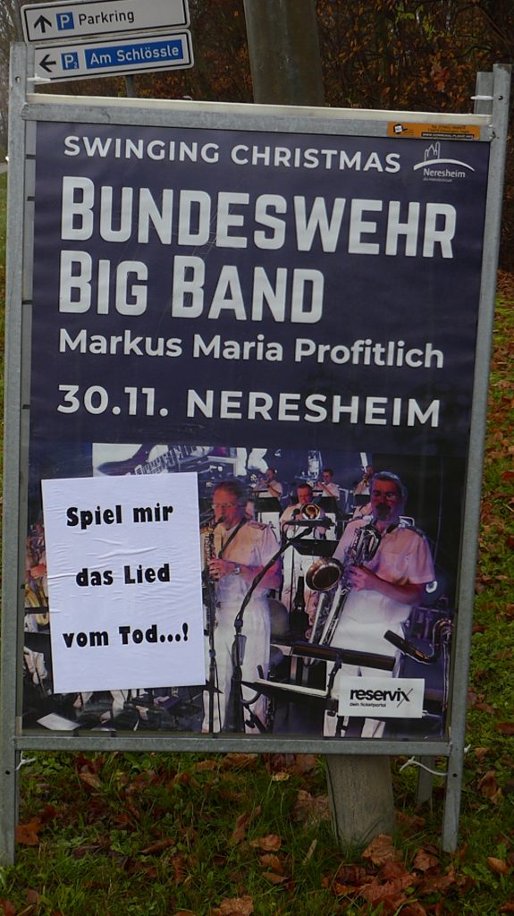 Wer denkt, dass Adbusting eine Sache aus den Metropolen sei, wird jetzt eines Besseren belehrt. Denn wir haben eine Zusendung aus Neresheim bekommen. Neresheim hat ca. 9000 Einwohner*innen und liegt im Dreieck zwischen Nürnberg, München und Stuttgart. Und am 30.11.2022 tritt dort die Bundeswehr-Bigband auf. Deswegen stehen dort Werbeplakate für den Auftritt. Und irgendwelche fiesen Chaot*innen sind nun dabei, den freundlichen Einheimischen den Spass zu verderben und haben einige der militärischen Werbeplakate mit A3-Zetteln beklebt. Auf den Überklebern steht: „Spiel mir das Lied von Tod!“