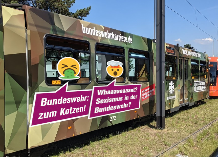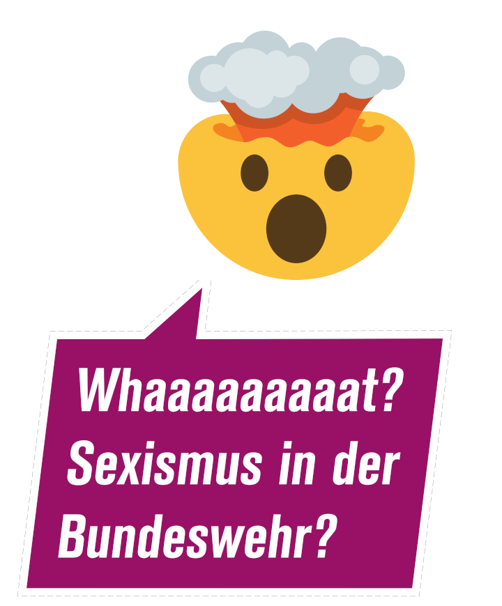 Um auf strukturelle toxische Maskulinität und Sexismus in der Bundeswehr, die sich gerne mal fälschlicherweise als offen und divers darstellt, hinzuweisen, heißt es neben dem erstaunten Kopfexplodier-Smiley: „Whaaat… Sexismus bei der Bundeswehr?‘. Denn allzu oft stellen die Bundeswehr und bürgerliche Medien Diskriminierung gegen FLINTA als Einzelfälle dar.
