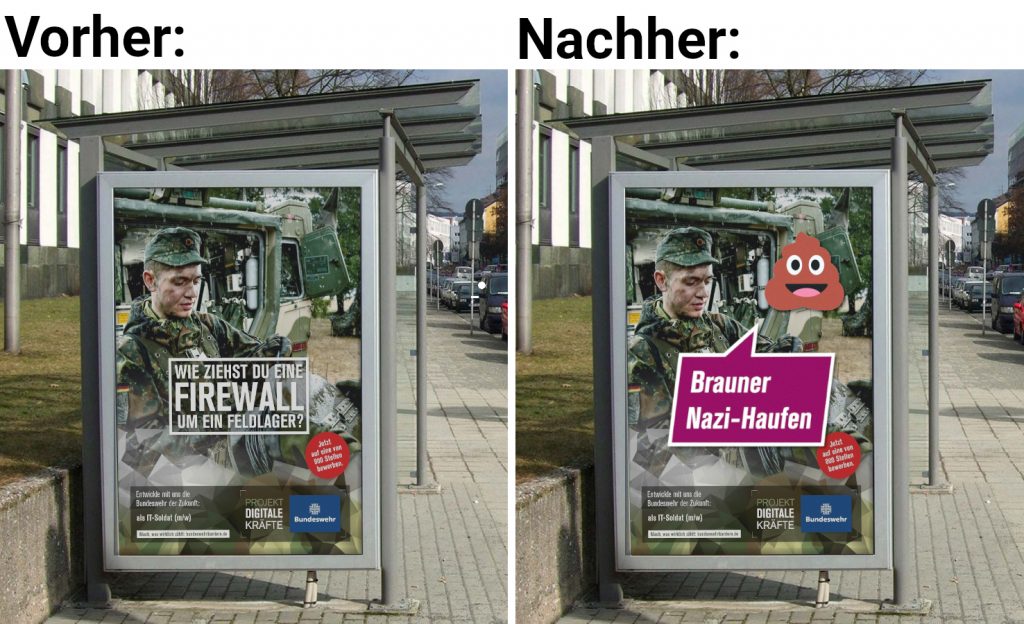 Ja, was ist das denn? Du bist morgens mit der Bahn unterwegs und da vermiest dir eines dieser hässlichen Bundeswehr-Werbeplakate den Tag? Und ausgerechnet heute hast du deine Rohrsteckschlüssel zum Öffnen der Werbevitrine verbummelt? Kein Problem, wir haben da mal was vorbereitet…