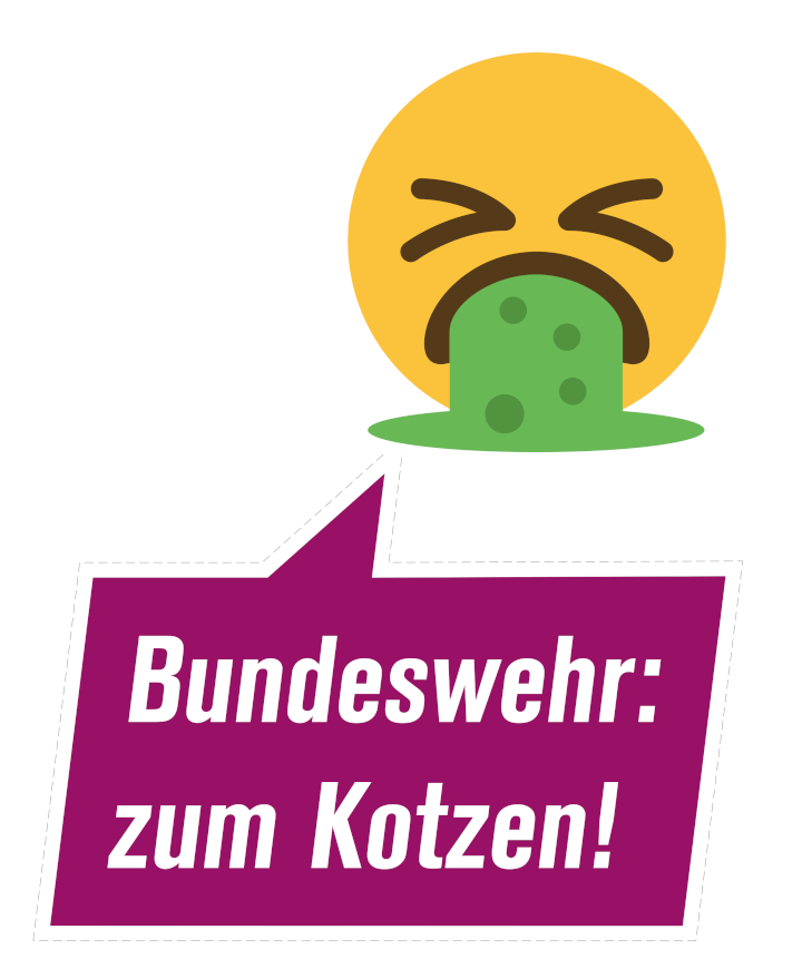 Auf einem weiteren Stickerset ist der Kotz-Smiley abgebildet und der Spruch lautet „Bundeswehr: zum Kotzen!“, denn wir werden es nicht hinnehmen dass Staaten fürs Sterben werben. - Explosions-Smiley