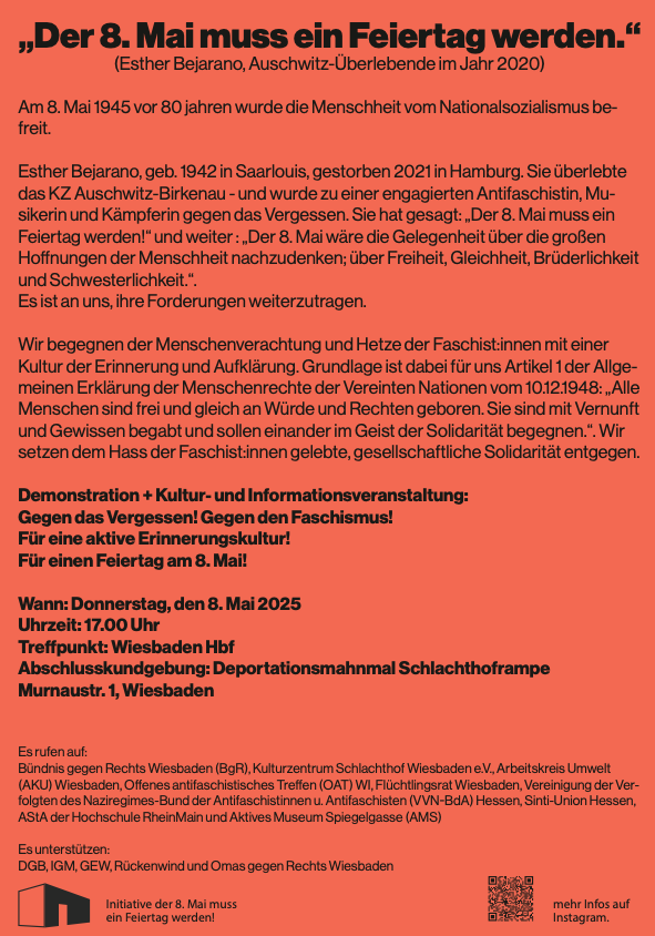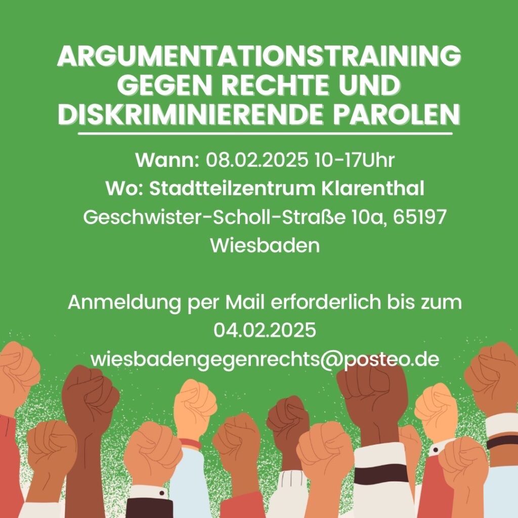 Die Teilnahme ist kostenlos aber wir stellen vor Ort eine Spendendose auf und freuen uns über Spenden für weitere Workshops und andere Aktivitäten des Wiesbadener Bündnis gegen Rechts.
