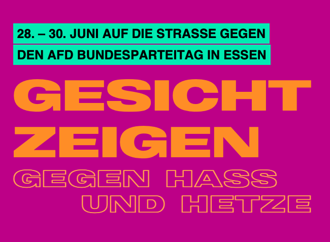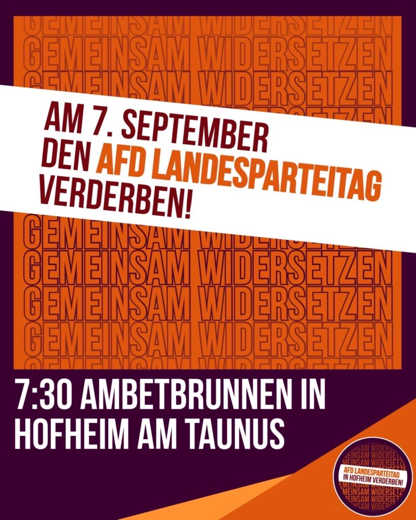 Den AfD Faschist*innen muss jeglicher Raum genommen werden. Daher werden wir am 7. September in Hofheim am Taunus mit bunten, kreativen Aktionen dem hessischen AfD Landesparteitag entgegenwirken. Wir treffen uns um 7.30 Uhr am Ambetbrunnen. Zusammen machen wir klar, keine Treffen von Faschist*innen in Rhein-Main!Die AfD ist eine faschistische Partei. Sie steht für Rassismus, Antifeminismus Queerfeindlichkeit, Behindertenfeidlichkeit/Ableismus,Antisemitismus und Leugnung der Verbrechen des Nationalsozialismus.Ihre Positionen zu sozialen und ökologischen Fragen sind existenzbedrohend. Die AfD greift das Prinzip der Menschenwürde frontal an. Mit ihren menschenfeindlichen Positionen dringt die Propaganda der AfD bis in die Mitte der Gesellschaft vor. Fast alle im Bundestag vertretenen Parteien bedienen sich mittlerweile bei den Themen, die von der AfD geliefert werden. Die Faschist*innen der AfD sprechen von bis zu 25 Millionen Menschen, die aus der Bundesrepublik mit „wohltemperierten Grausamkeiten“ entfernt werden sollen. Wurden aus der Bundesrepublik bisher jährlich etwas mehr als zehntausend Menschen „rückgeführt“, fordern die Regierungsparteien und die Union jetzt populistisch diese Zahlen prozentual wesentlich zu erhöhen. Die Übernahme solcher menschenfeindlicher Themensetzungen hat jedoch fatale Folgen. Menschenverachtende Ideen und menschenfeindliche Entscheidungen werden in der Gesellschaft verfestigt. Ausgrenzung und Entwertung anderer Menschen darf niemals die Antwort auf reale oder vermeintliche Krisen sein.Gegen die von CORRECTIV enthüllten bürgerkriegsähnlichen Szenarien der Faschist*innen der AfD und ihrer Sympathisant*innen gingen in den ersten Monaten dieses Jahres Millionen Menschen auf die Straße. Die AfD verlor in den Meinungsumfragen fast ein Drittel ihrer Zustimmung.